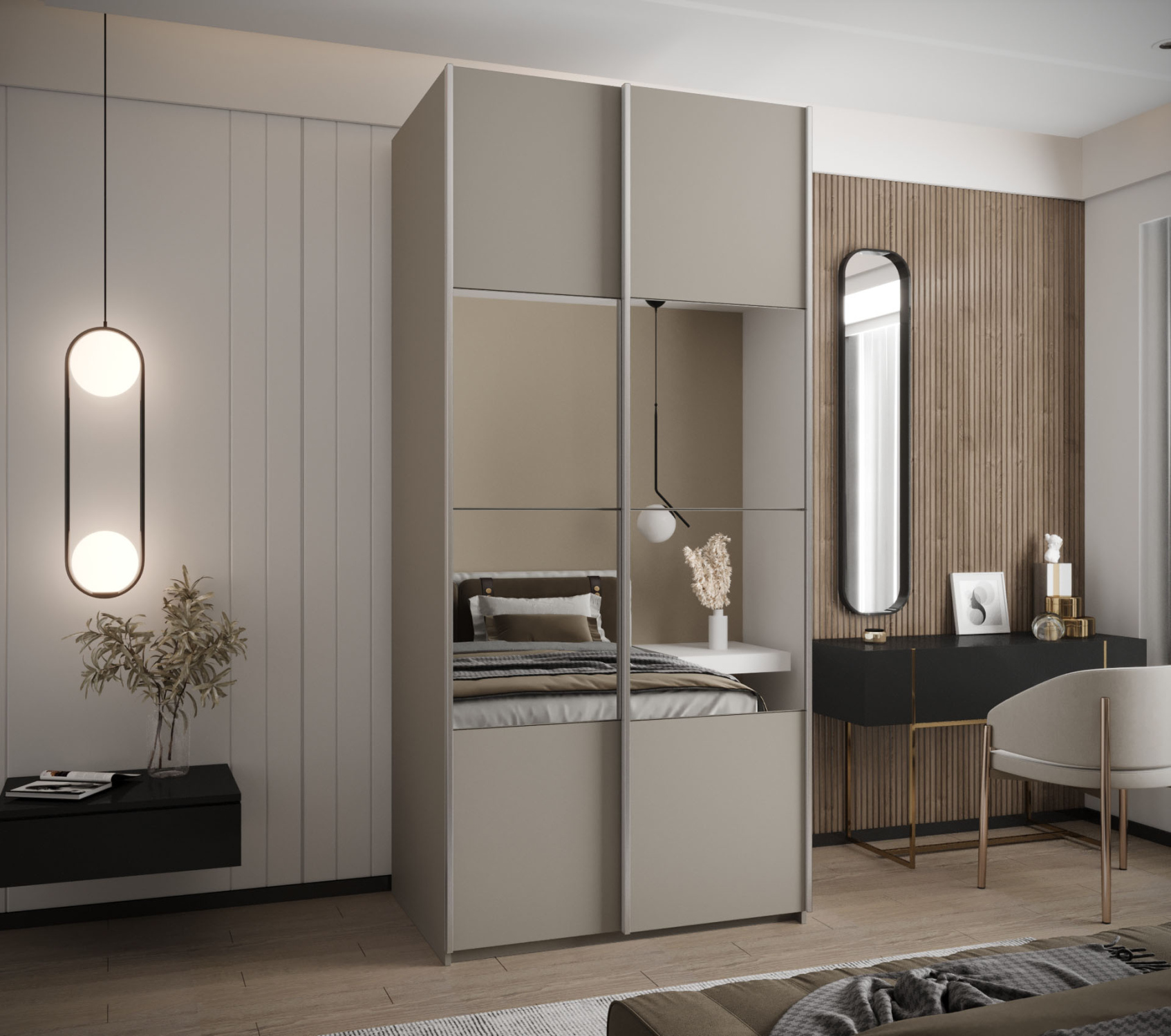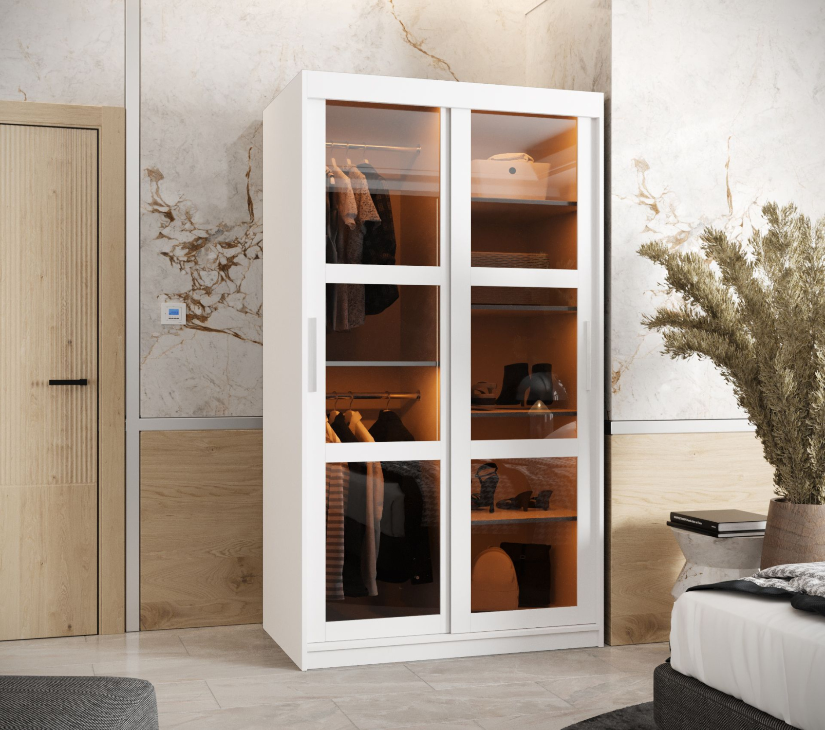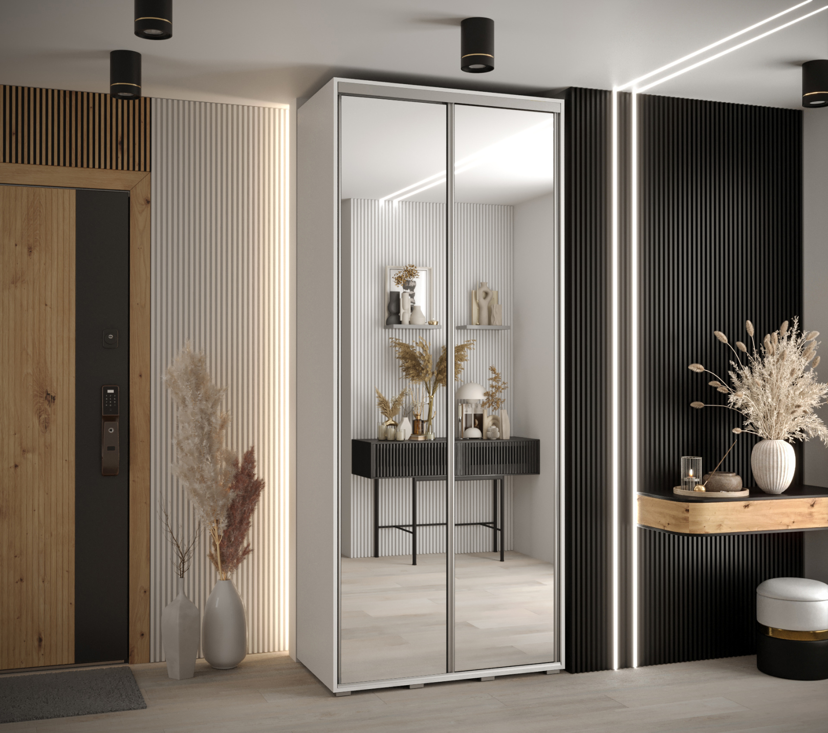 Šatní skříň INDIRA 8 je vyrobena v moderním designu. Skříň je vybavena posuvnými dveřmi, které usnadňují manipulaci a šetří prostor v interiéru.