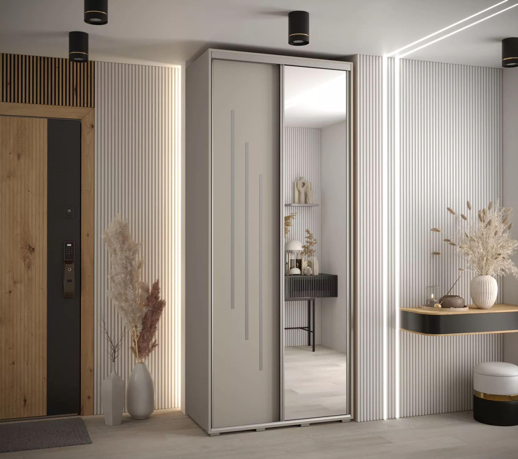 Šatní skříň INDIRA 9 je vyrobena v moderním designu. Skříň je vybavena posuvnými dveřmi, které usnadňují manipulaci a šetří prostor v interiéru.