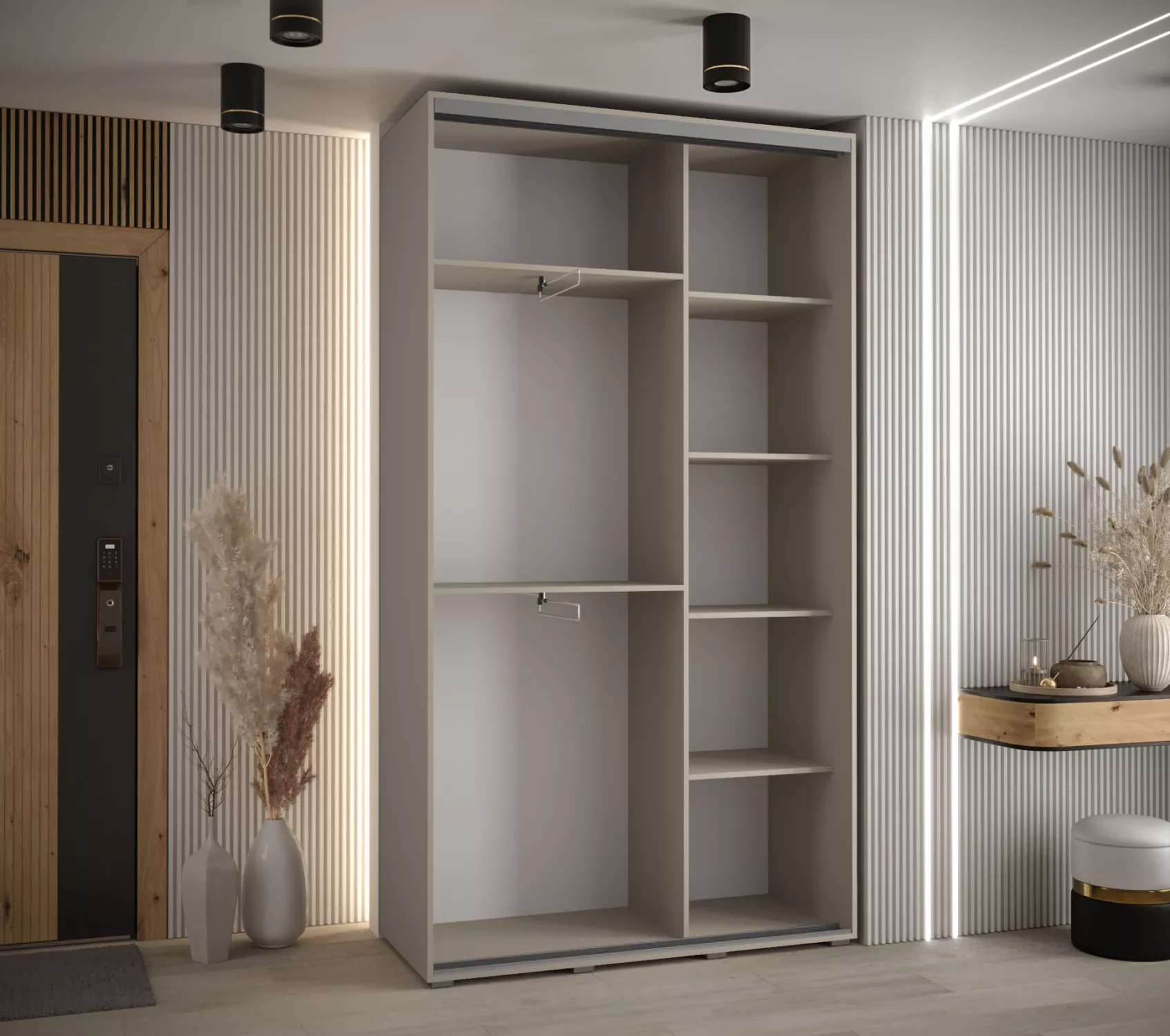 Šatní skříň INDIRA 10 je vyrobena v moderním designu. Skříň je vybavena posuvnými dveřmi, které usnadňují manipulaci a šetří prostor v interiéru.