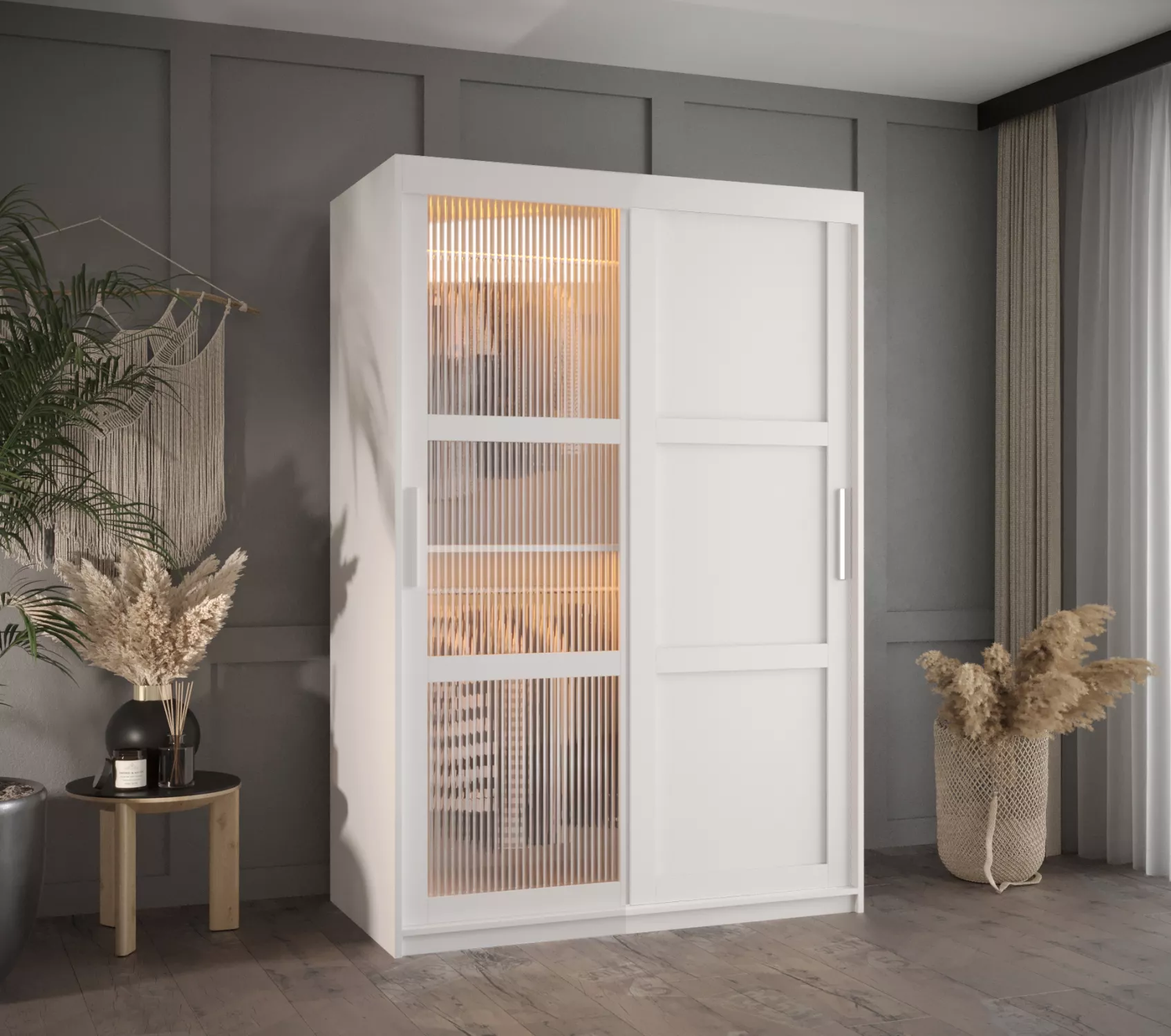 Šatní skříň SHERYL 3 zaujme především prosklenými dvířky. Vnitřek skříně je vybaven policovým systémem a 2 šatními tyčemi.