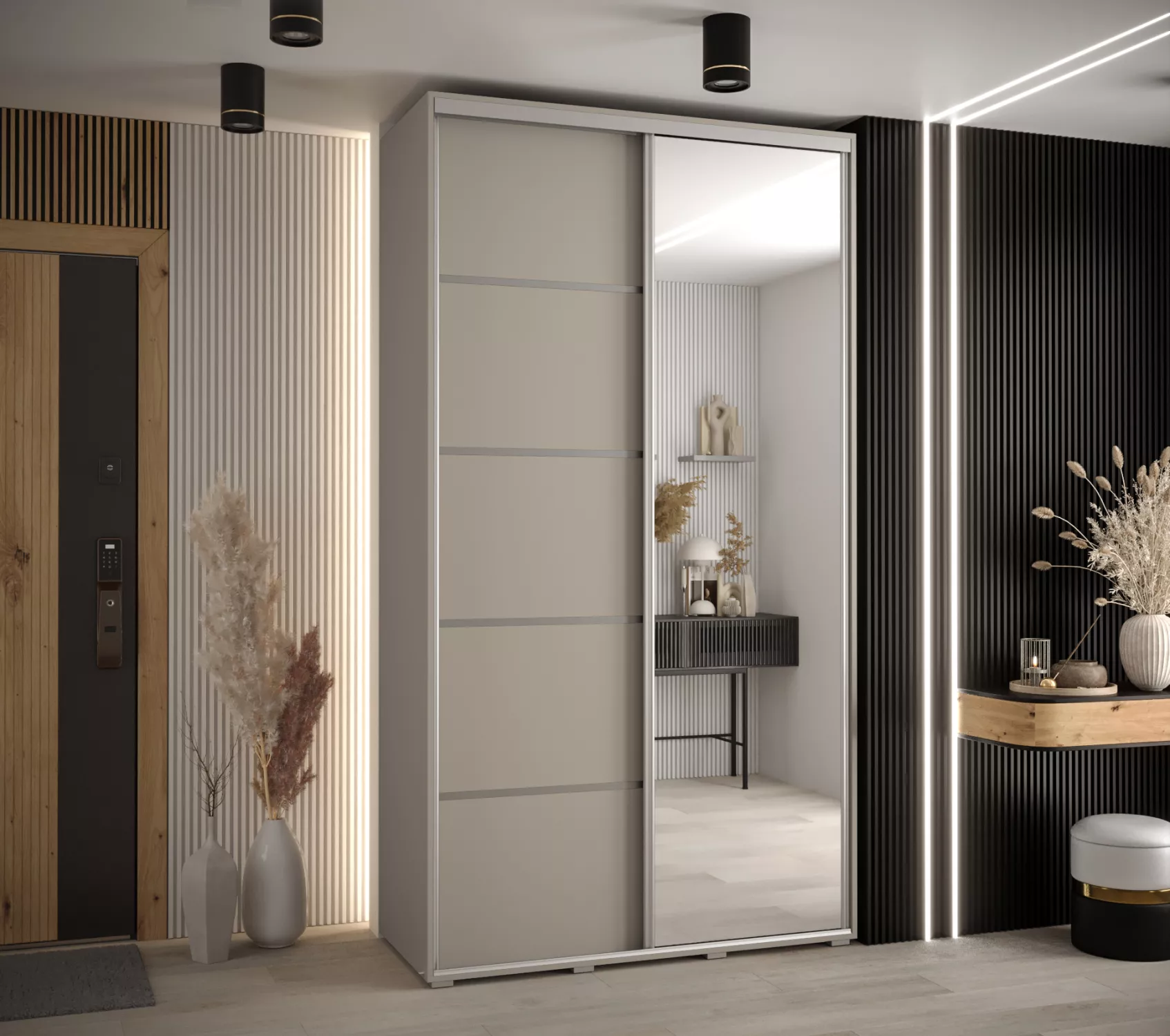 Šatní skříň INDIRA 5 je vyrobena v moderním designu. Skříň je vybavena posuvnými dveřmi, které usnadňují manipulaci a šetří prostor v interiéru.