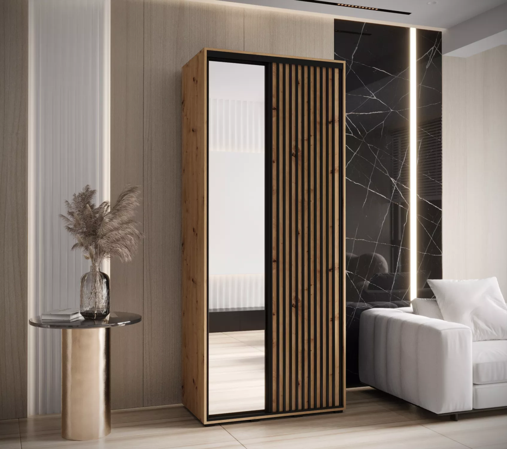 Šatní skříň BAYLIN 2 zaujme především moderními lamelami. Vnitřek skříně je vybaven policovým systémem a 1 výsuvnou šatní tyči.