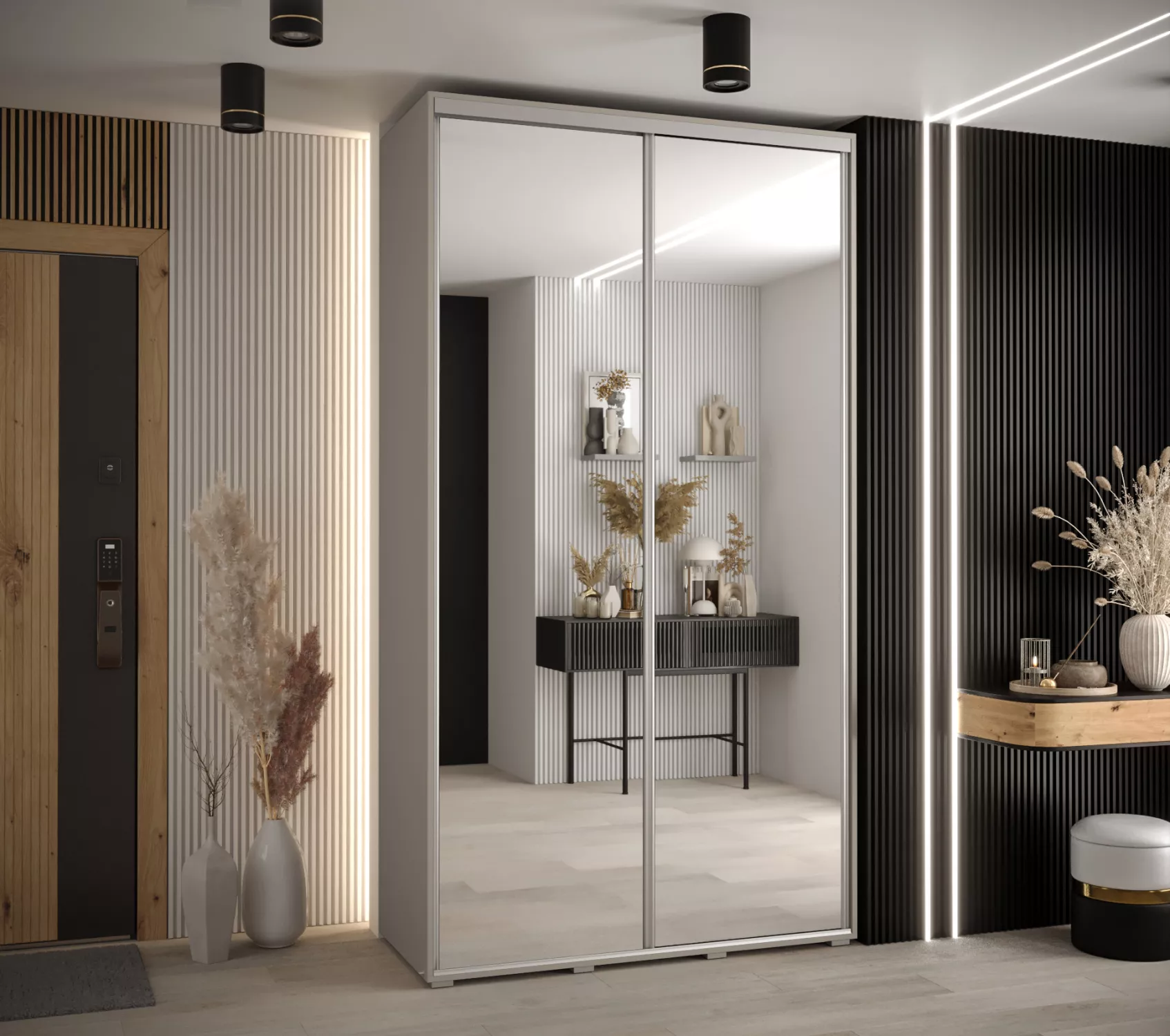 Šatní skříň INDIRA 2 je vyrobena v moderním designu. Skříň je vybavena posuvnými dveřmi, které usnadňují manipulaci a šetří prostor v interiéru.