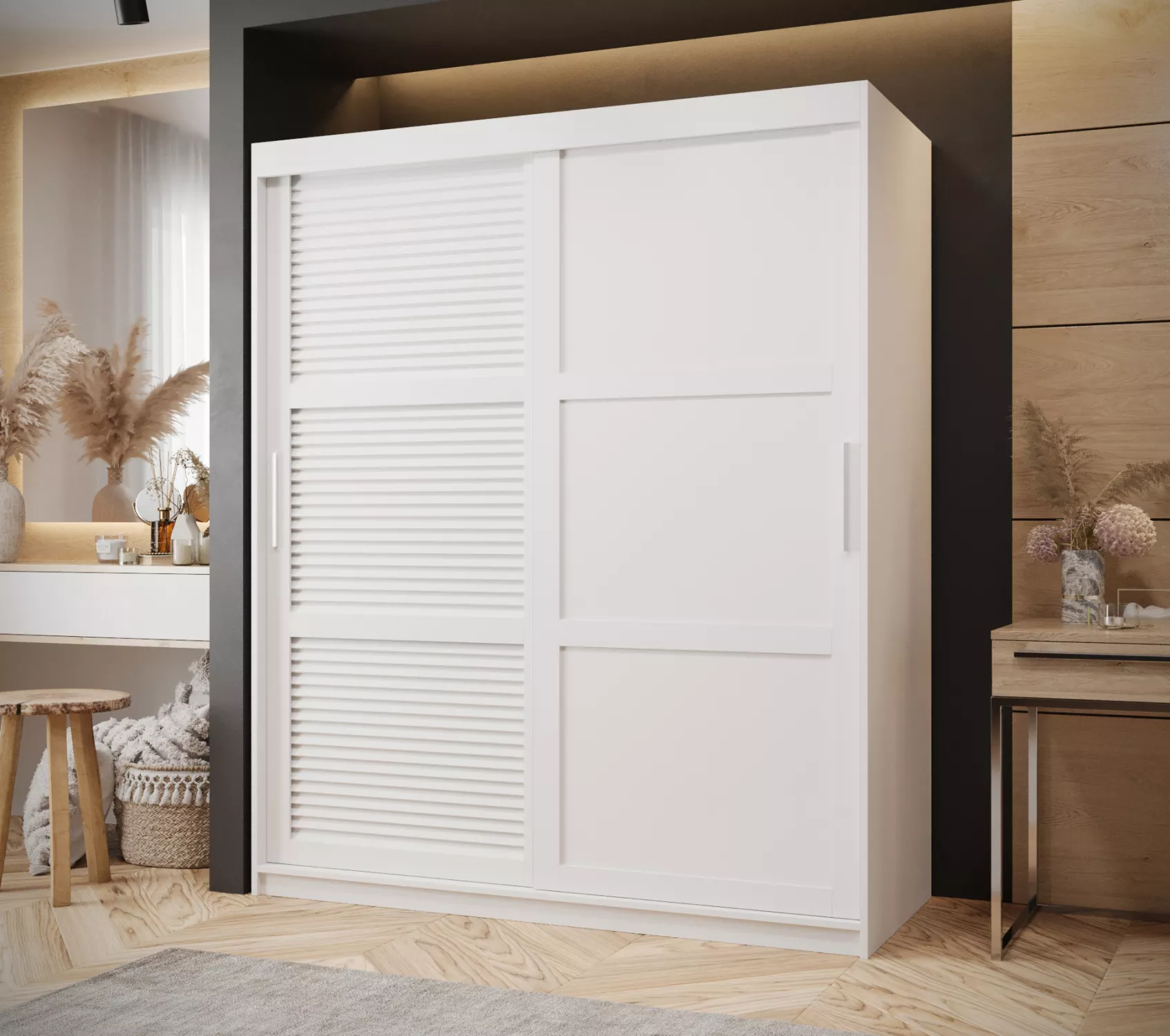 Šatní skříň MATILDA 3 zaujme především stylovými dvířky. Vnitřek skříně je vybaven policovým systémem a 2 šatními tyčemi.