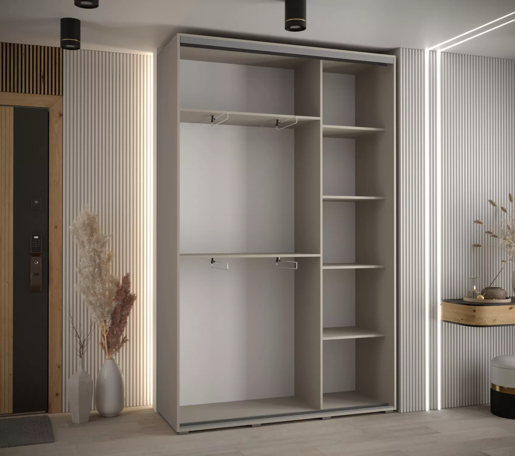 Šatní skříň INDIRA 12 je vyrobena v moderním designu. Skříň je vybavena posuvnými dveřmi, které usnadňují manipulaci a šetří prostor v interiéru.