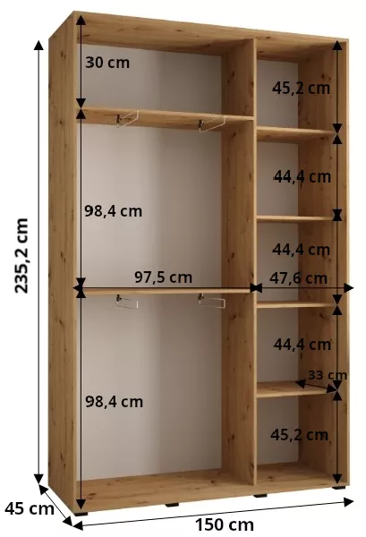 Šatní skříň INDIRA 5 je vyrobena v moderním designu. Skříň je vybavena posuvnými dveřmi, které usnadňují manipulaci a šetří prostor v interiéru.