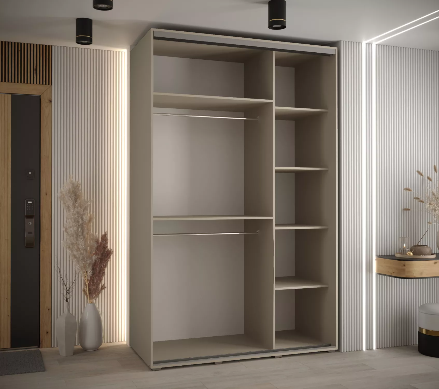 Šatní skříň INDIRA 13 je vyrobena v moderním designu. Skříň je vybavena posuvnými dveřmi, které usnadňují manipulaci a šetří prostor v interiéru.