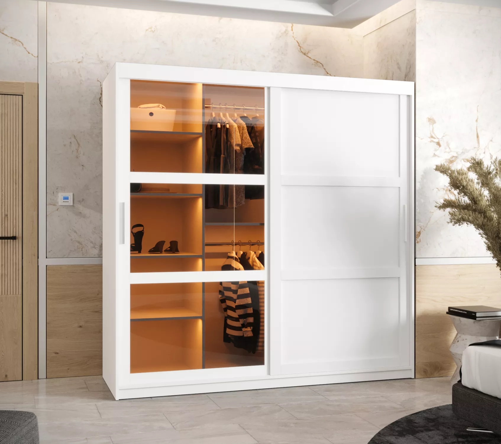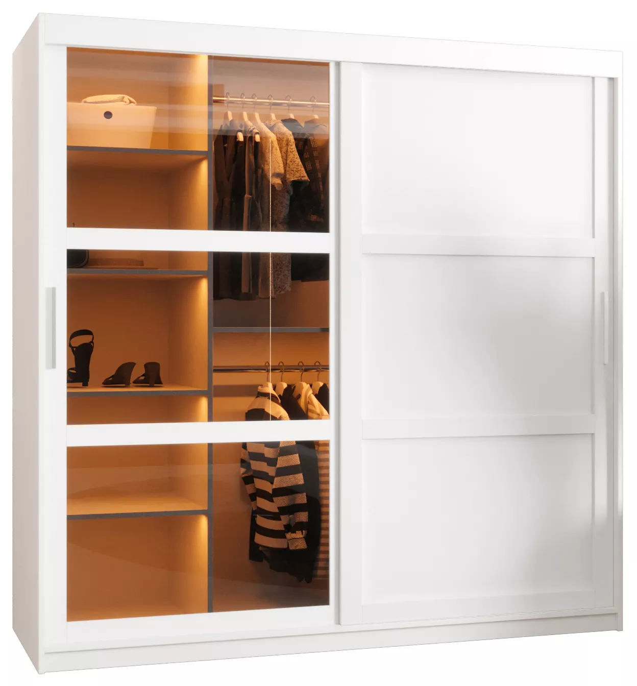 Šatní skříň KATIE 2 se hodí do všech moderních ložnic či šatníků. Vnitřek skříně je vybaven policovým systémem a 2 šatními tyčemi.
