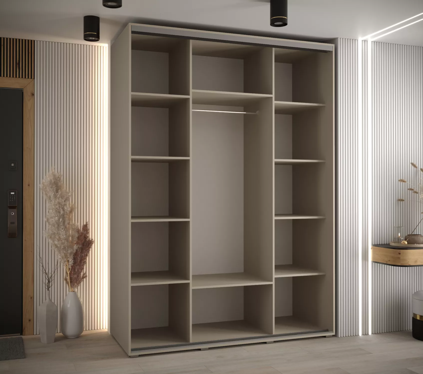 Šatní skříň INDIRA 3 je vyrobena v moderním designu. Skříň je vybavena posuvnými dveřmi, které usnadňují manipulaci a šetří prostor v interiéru.