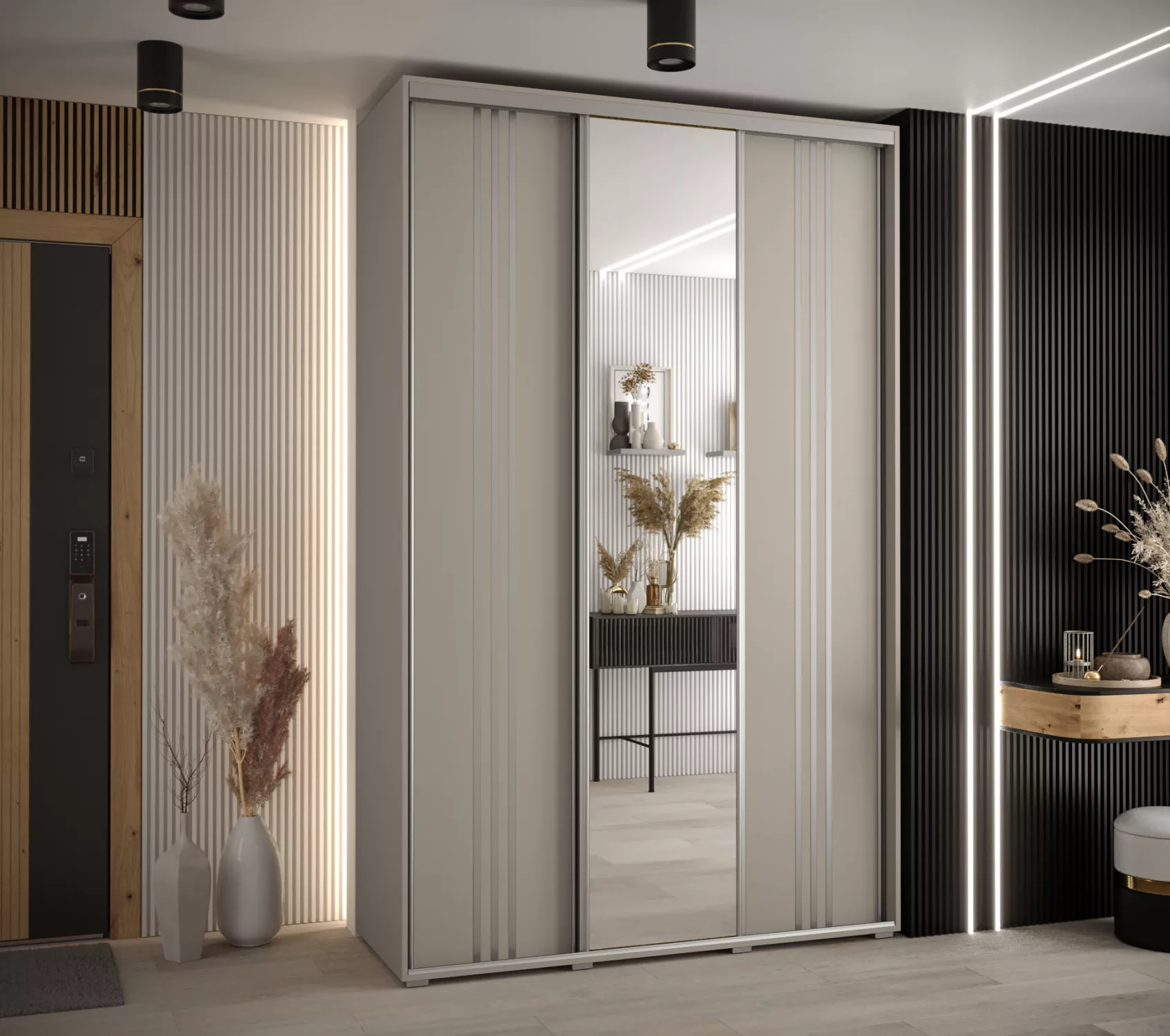 Šatní skříň INDIRA 7 je vyrobena v moderním designu. Skříň je vybavena posuvnými dveřmi, které usnadňují manipulaci a šetří prostor v interiéru.