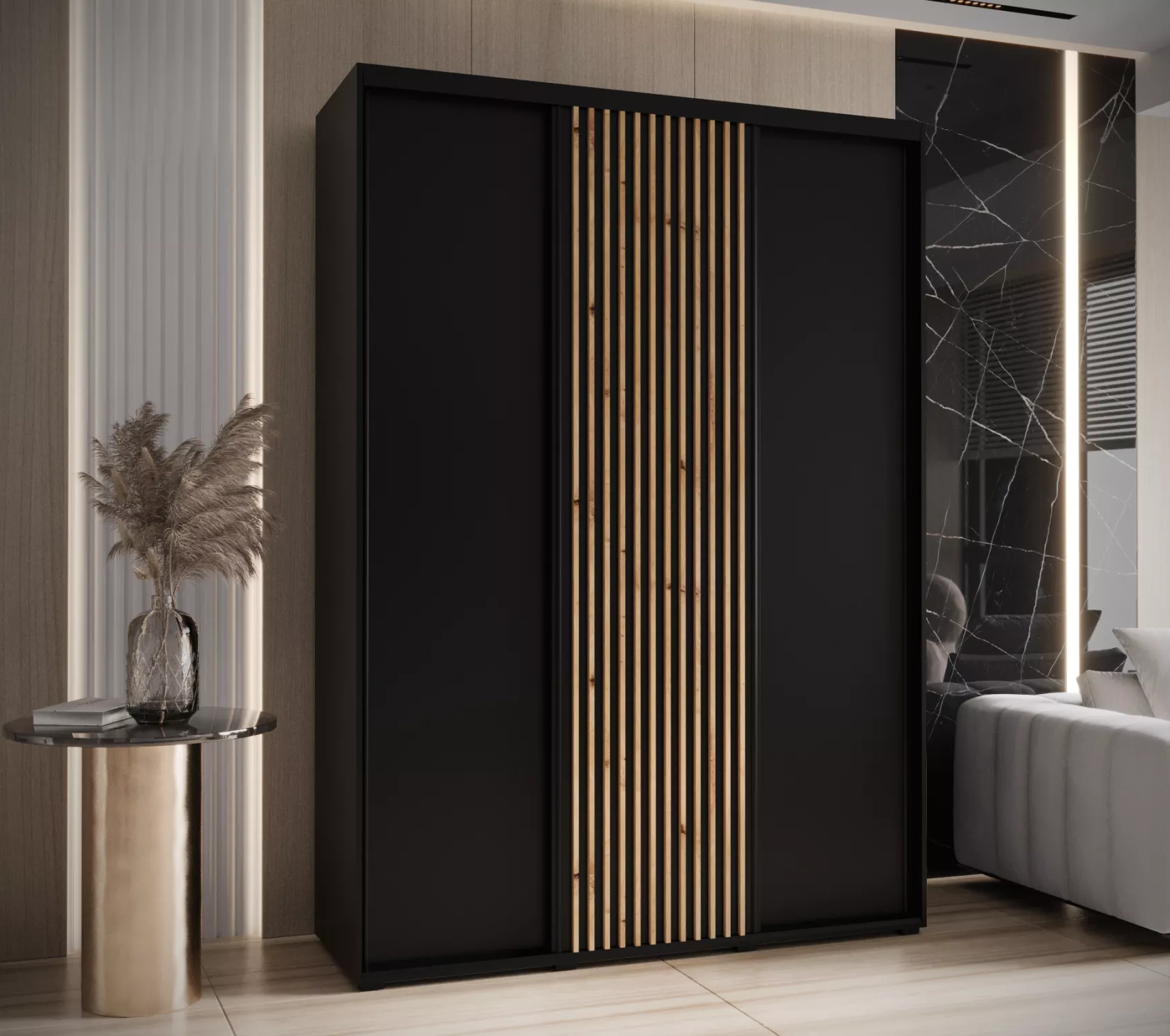 Šatní skříň FIDELIA 1 - 180/45 cm, černá / černá / dub artisan