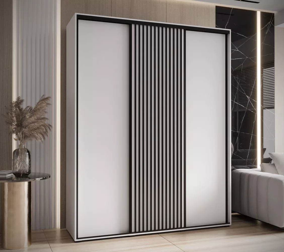 Šatní skříň BAYLIN 1 zaujme především moderními lamelami. Vnitřek skříně je vybaven policovým systémem a 2 výsuvnými šatními tyčemi.