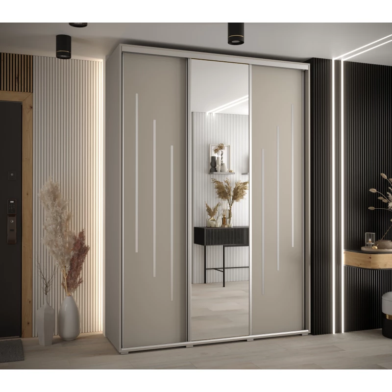 Šatní skříň INDIRA 9 je vyrobena v moderním designu. Skříň je vybavena posuvnými dveřmi, které usnadňují manipulaci a šetří prostor v interiéru.
