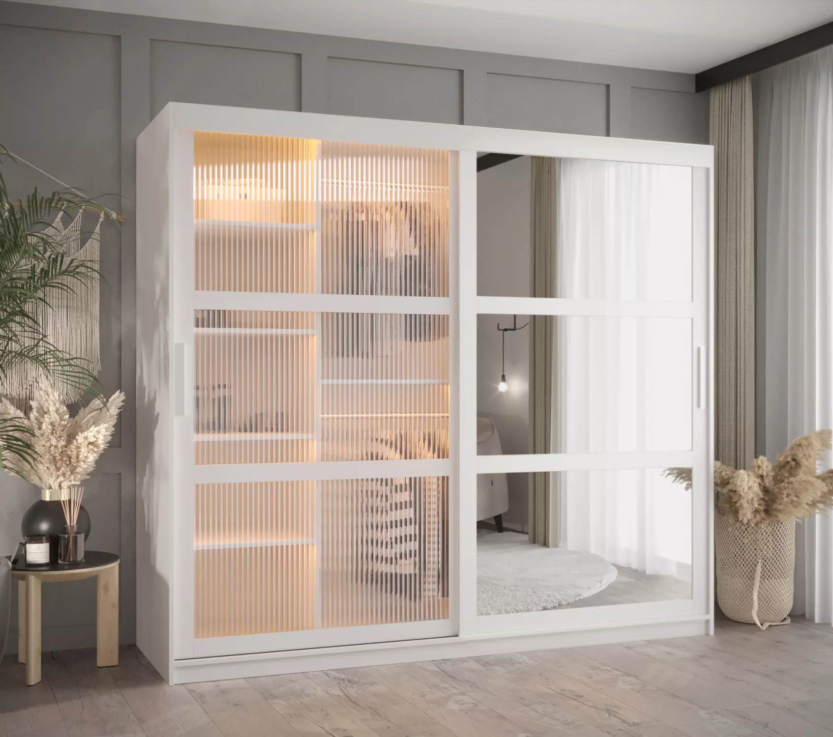 Šatní skříň SHERYL 2 zaujme především prosklenými dvířky. Vnitřek skříně je vybaven policovým systémem a 2 šatními tyčemi.