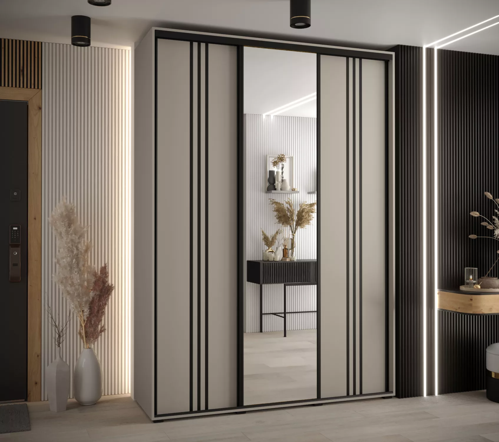 Šatní skříň INDIRA 7 je vyrobena v moderním designu. Skříň je vybavena posuvnými dveřmi, které usnadňují manipulaci a šetří prostor v interiéru.