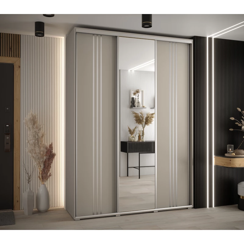 Šatní skříň INDIRA 7 je vyrobena v moderním designu. Skříň je vybavena posuvnými dveřmi, které usnadňují manipulaci a šetří prostor v interiéru.