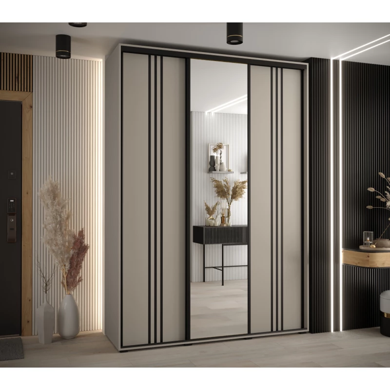 Šatní skříň INDIRA 7 je vyrobena v moderním designu. Skříň je vybavena posuvnými dveřmi, které usnadňují manipulaci a šetří prostor v interiéru.