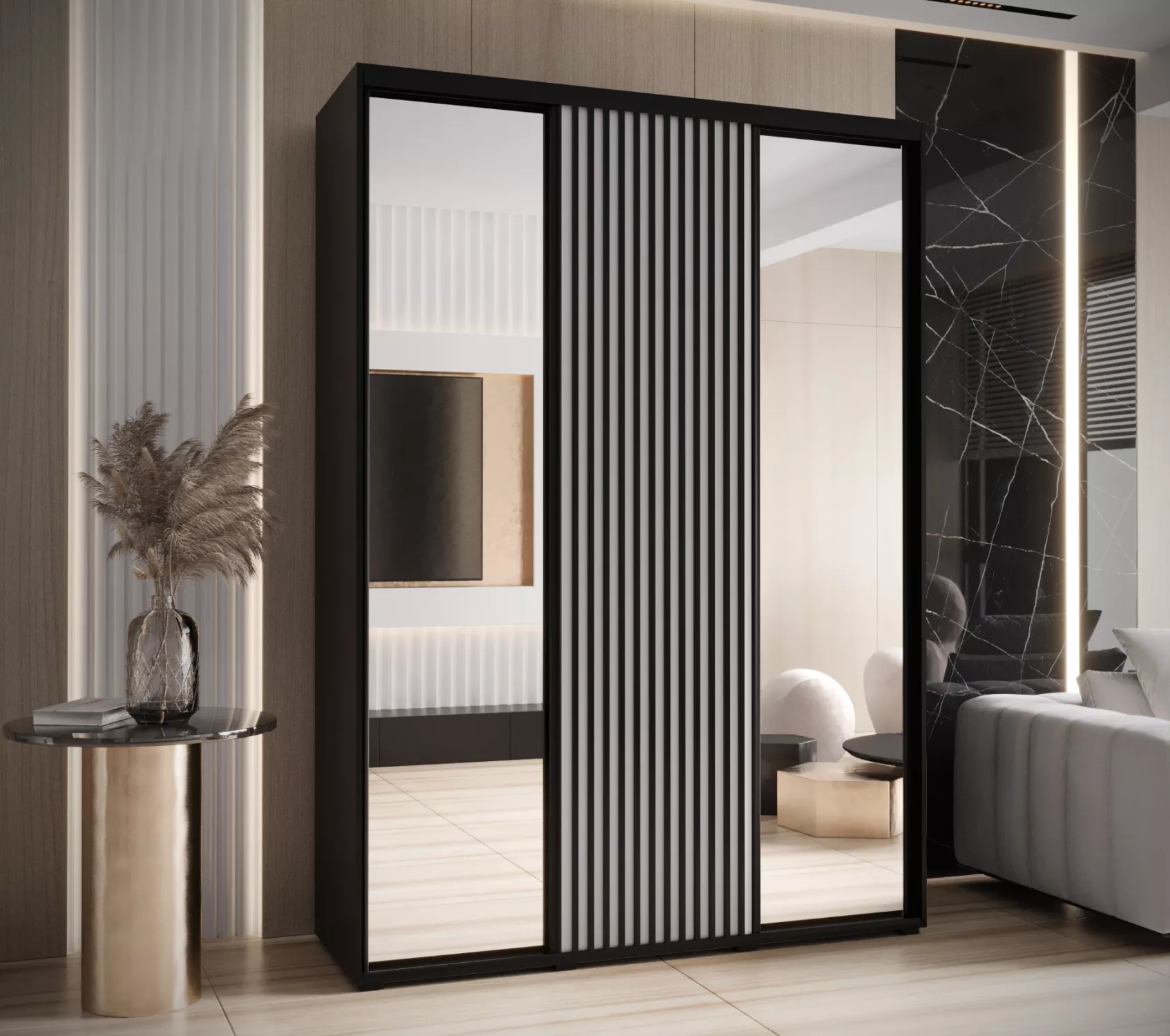 Šatní skříň BAYLIN 2 zaujme především moderními lamelami. Vnitřek skříně je vybaven policovým systémem a 1 šatní tyči.