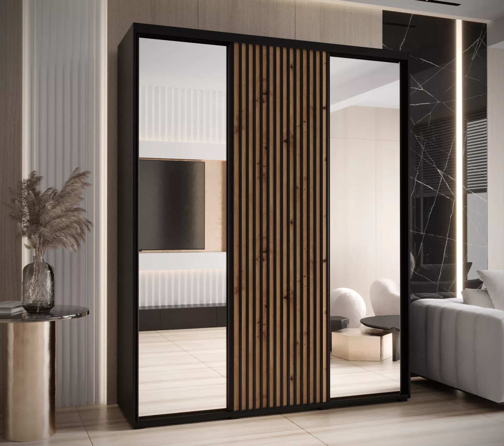 Šatní skříň BAYLIN 2 zaujme především moderními lamelami. Vnitřek skříně je vybaven policovým systémem a 2 výsuvnými šatními tyčemi.