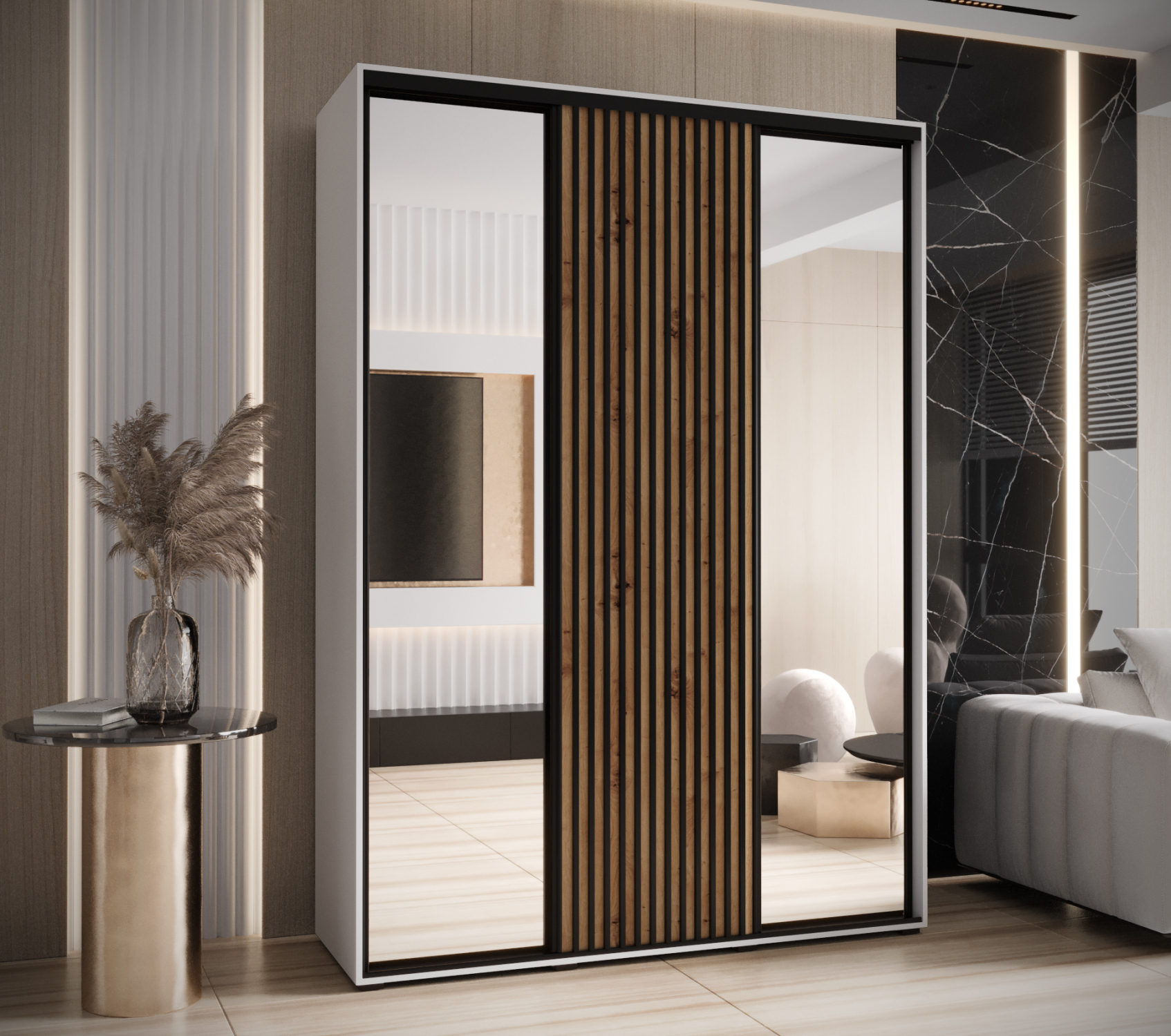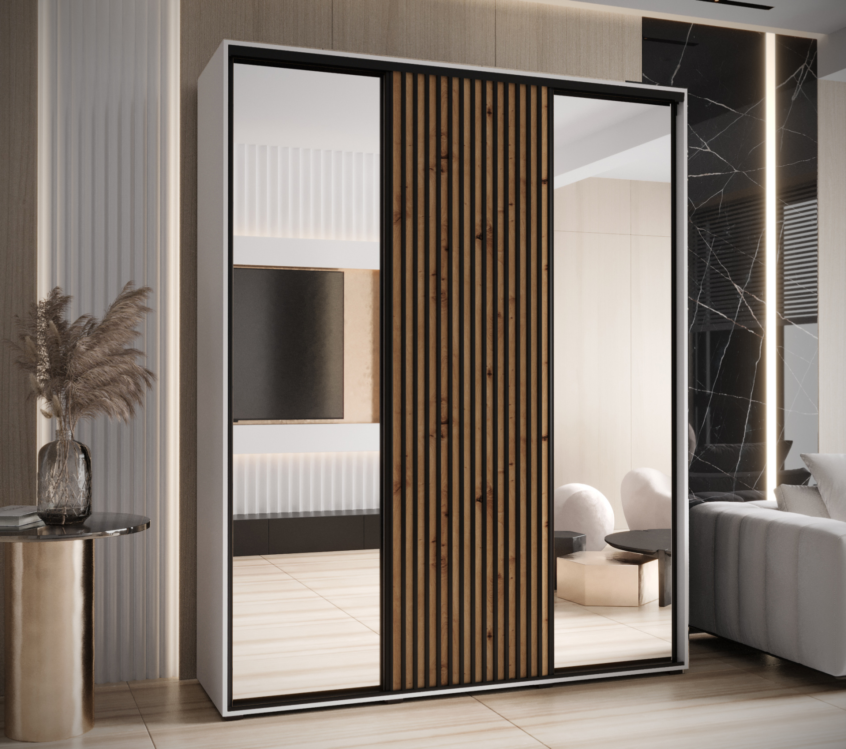 Šatní skříň FIDELIA 2 se hodí do všech moderních interiérů. Skříň je vybavena posuvnými dveřmi pro snadnější manipulaci a ušetření prostoru při otevírání.