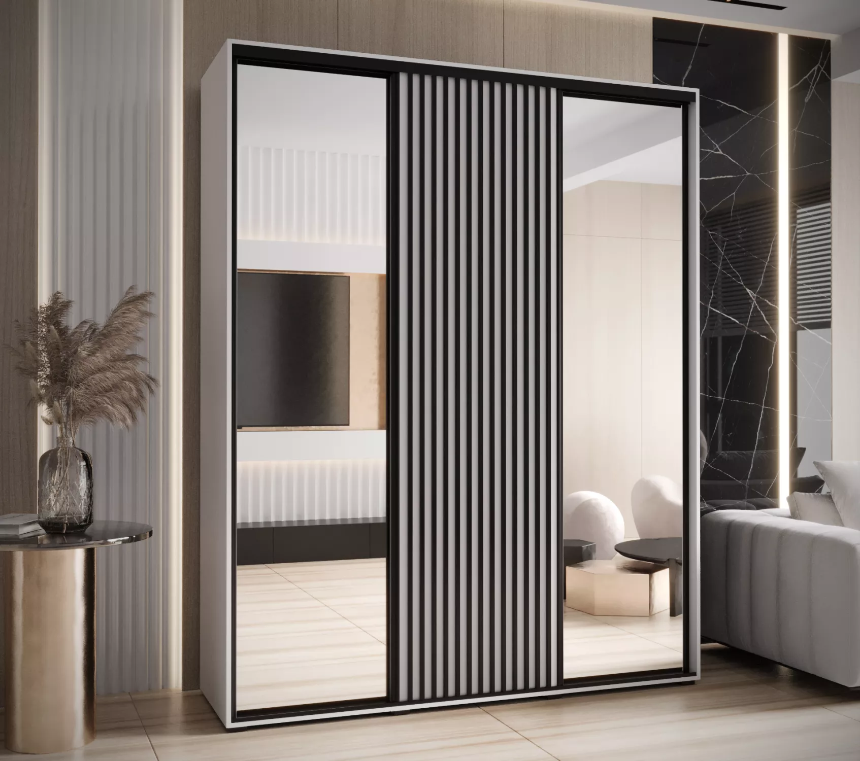 Šatní skříň BAYLIN 2 zaujme především moderními lamelami. Vnitřek skříně je vybaven policovým systémem a 2 výsuvnými šatními tyčemi.