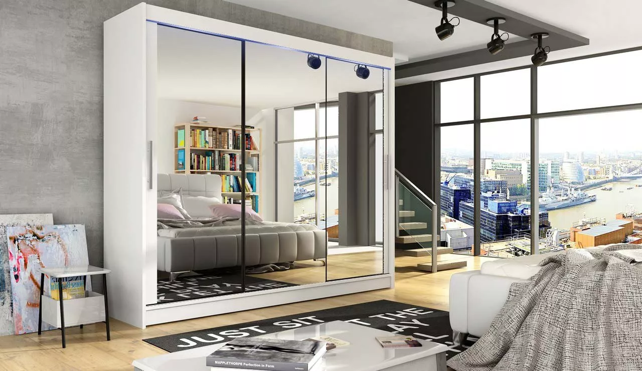 Vysoká šatní skříň se zrcadlem 250 cm HORTENSIA 3 - bílá + RGB osvětlení ZDARMA