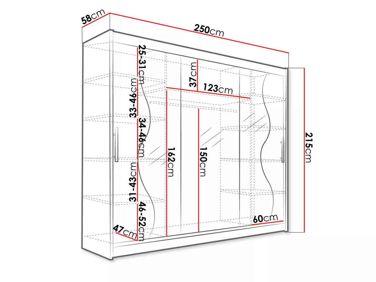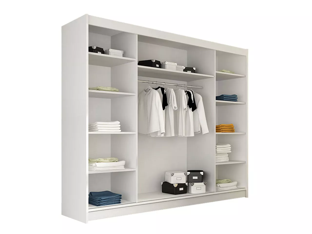 HORTENSIA 3 s LED osvětlením je mimořádně prostorná šatní skříň s posuvnými dveřmi v moderním stylu. Nepochybnou výhodou je velké zrcadlo, které opticky zvětšuje prostor a vnáší do místnosti více světla. Interiér šatní skříně vás okouzlí svým přívětivým a funkčním uspořádáním.