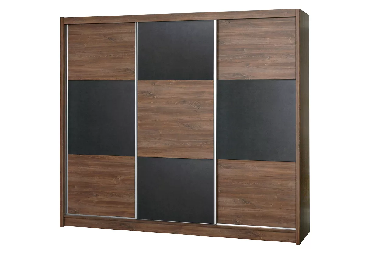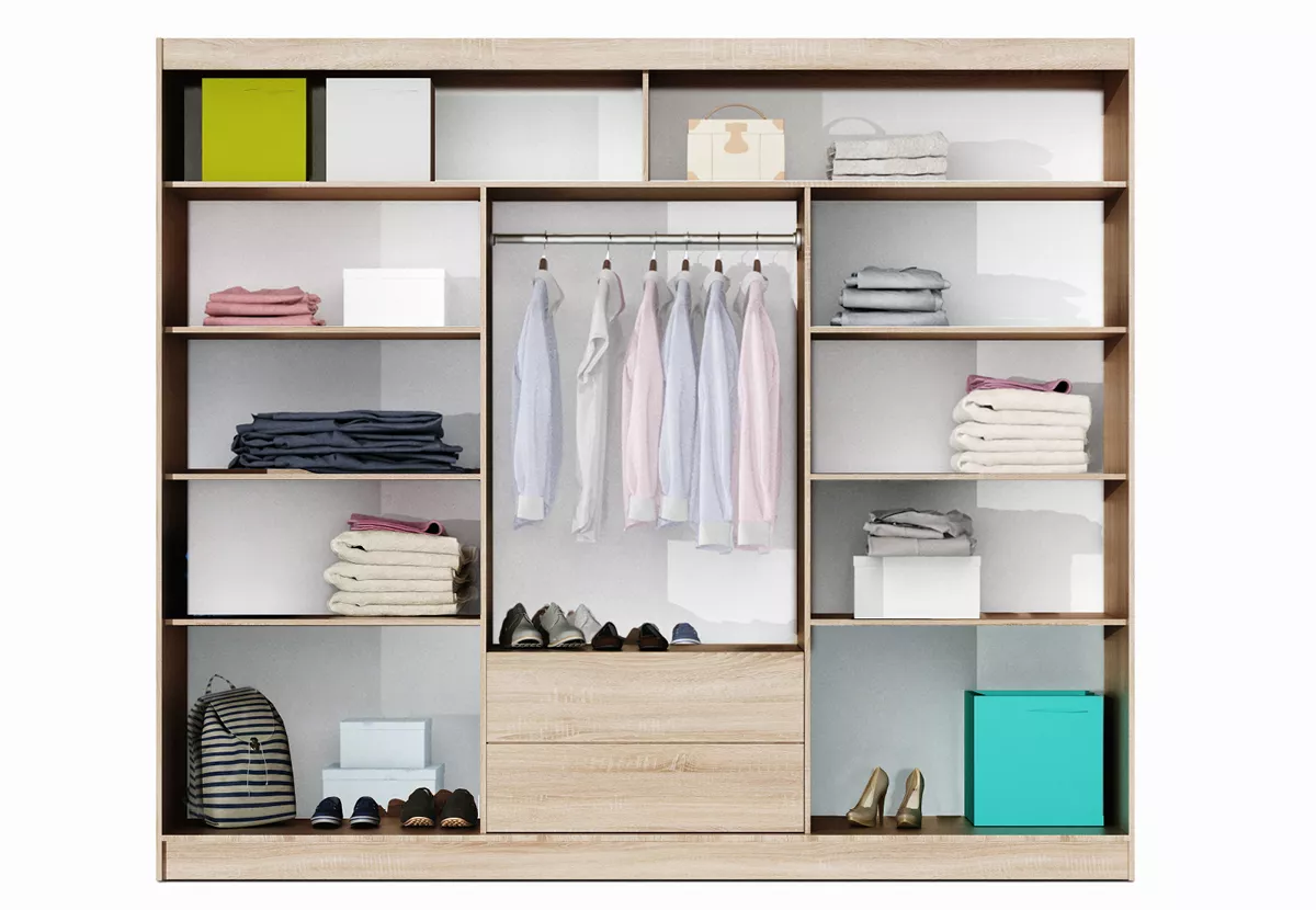 Šatní skříň s posuvnými dveřmi NAOK se hodí do všech moderních ložnic. Skříň nabízí dostatek úložného prostoru v podobě 8 polic, 2 šuplíků a 1 šatní tyče.