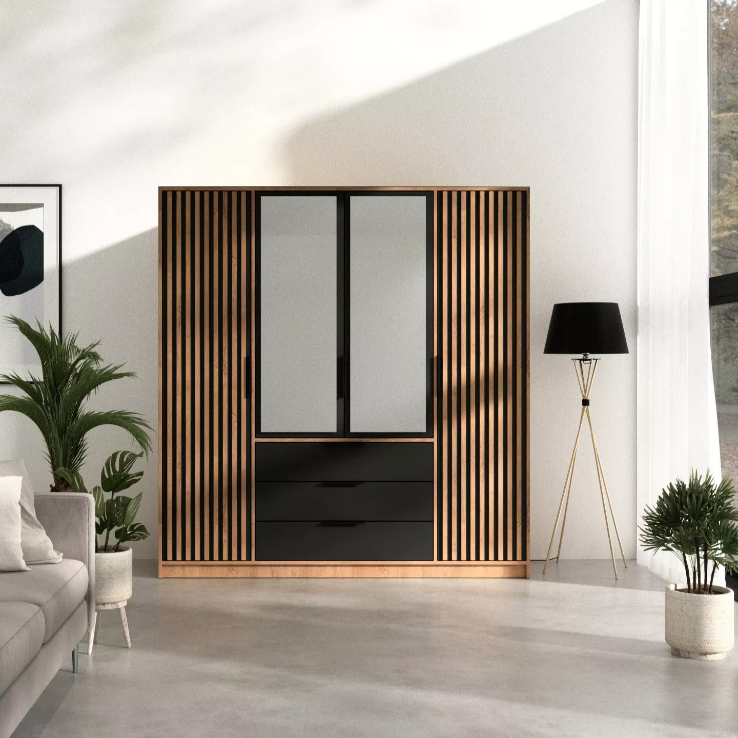 Čtyřdveřová šatní skříň 196 AGNESA se zrcadly - dub wotan / černá