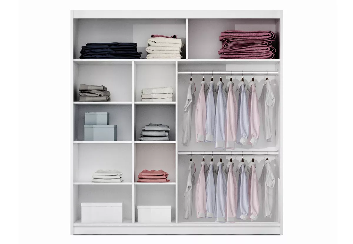 Šatní skříň se zrcadly JULIA se hodí do všech moderních ložnic. Skříň nabízí dostatek úložného prostoru v podobě 8 polic a 2 šatních tyčí.