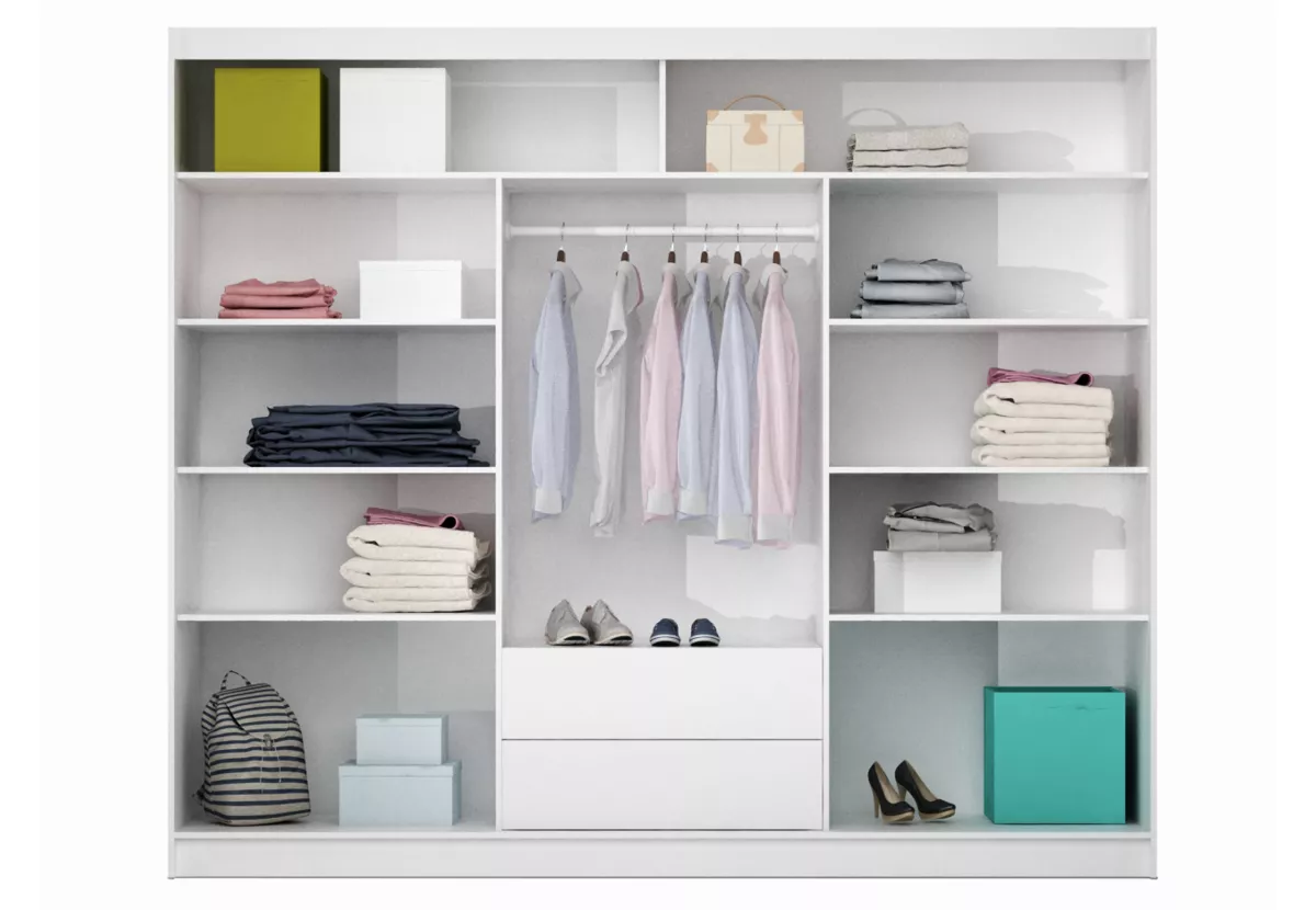 Šatní skříň s posuvnými dveřmi KLAUDIE se hodí do všech moderních ložnic. Skříň nabízí dostatek úložného prostoru v podobě 8 polic, 2 šuplíků a 1 šatní tyče.