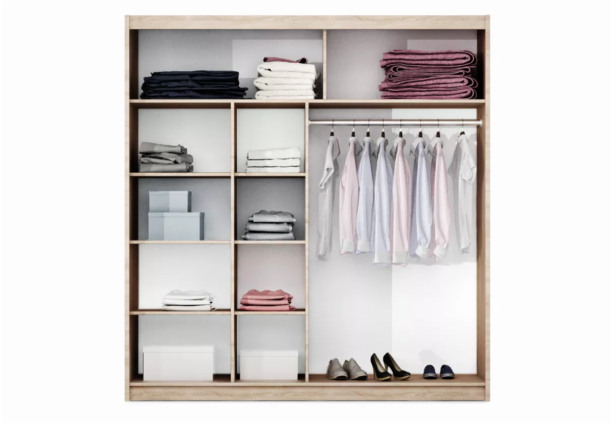 Šatní skříň s posuvnými dveřmi SOLANGE se hodí do všech moderních ložnic. Skříň nabízí dostatek úložného prostoru v podobě 8 polic a 1 šatní tyče.