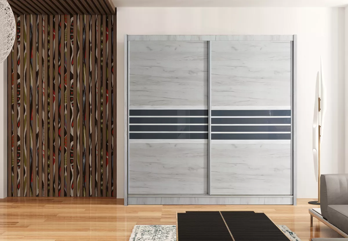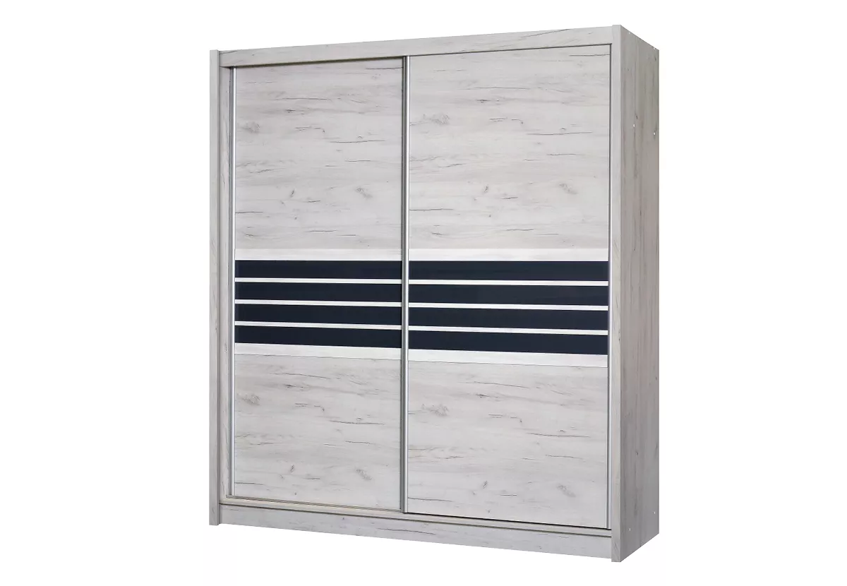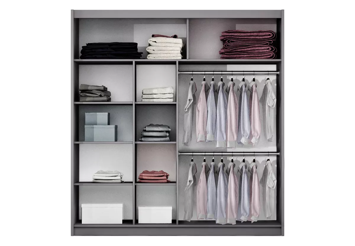 Šatní skříň s posuvnými dveřmi DIONE se hodí do všech moderních ložnic. Systém posuvných dveří ušetří místo v prostoru. Součástí skříně je 8 polic a 2 šatní tyče.