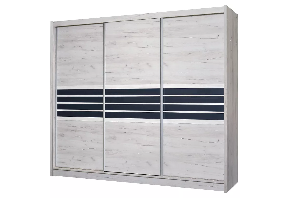 Šatní skříň s posuvnými dveřmi DIONE se hodí do všech moderních ložnic. Systém posuvných dveří ušetří místo v prostoru. Součástí skříně je 8 polic, 2 šuplíky a šatní tyč.