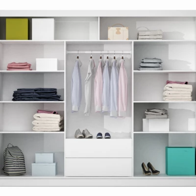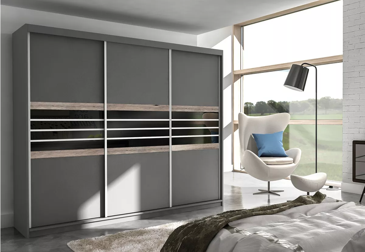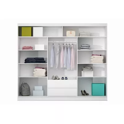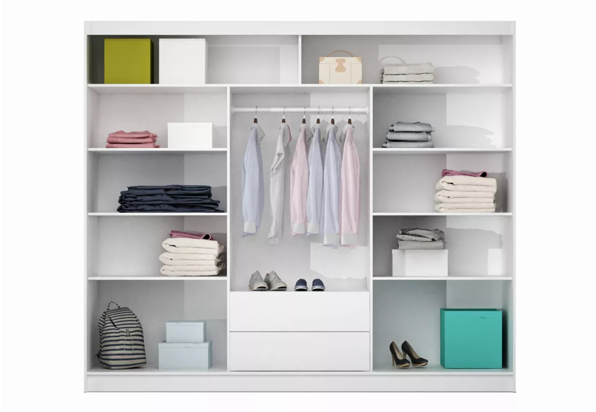 Šatní skříň s posuvnými dveřmi DIONE se hodí do všech moderních ložnic. Systém posuvných dveří ušetří místo v prostoru. Součástí skříně je 8 polic, 2 šuplíky a šatní tyč.