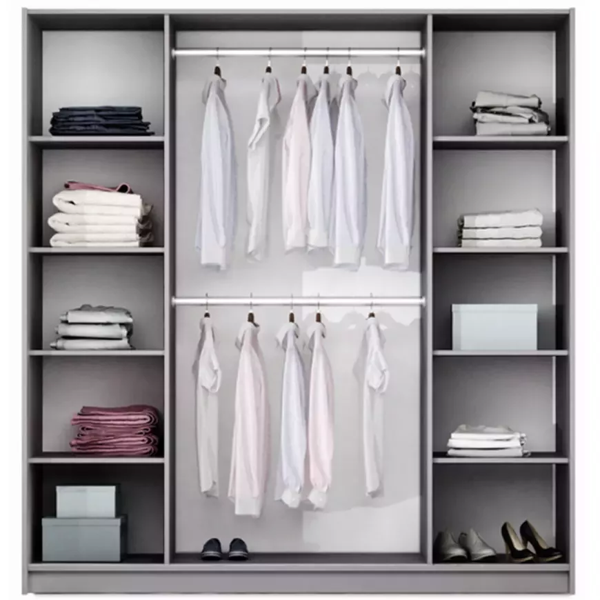 Šatní skříň se zrcadly EVELINE se hodí do všech moderních ložnic. Systém posuvných dveří ušetří místo v prostoru. Součástí skříně je 8 polic a 2 šatní tyče.