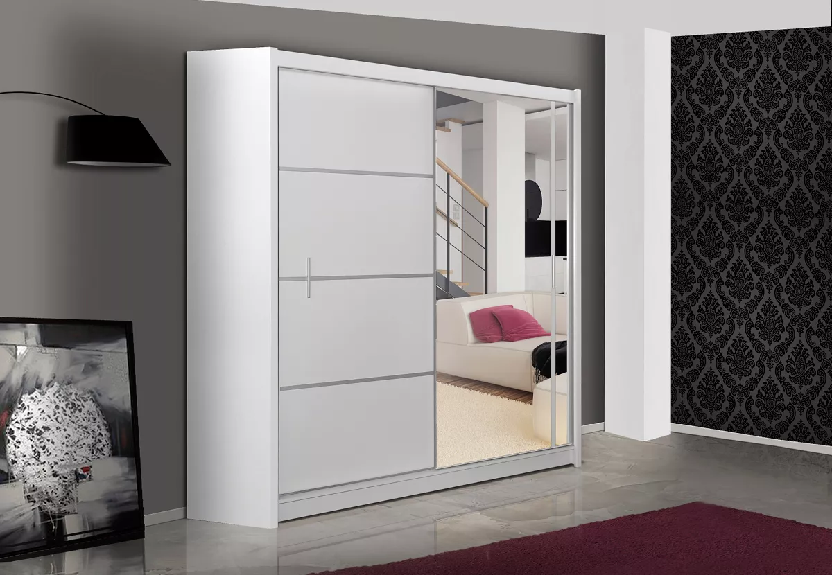 Šatní skříň se zrcadlem CHITA se hodí do všech moderních ložnic. Systém posuvných dveří ušetří místo v prostoru. Součástí skříně jsou 4 police a 2 šatní tyče.