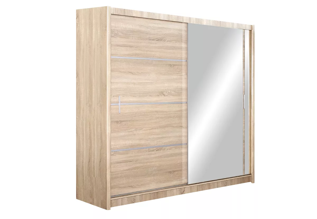 Šatní skříň se zrcadlem CHITA se hodí do všech moderních ložnic. Systém posuvných dveří ušetří místo v prostoru. Součástí skříně je 8 polic a 2 šatní tyče.