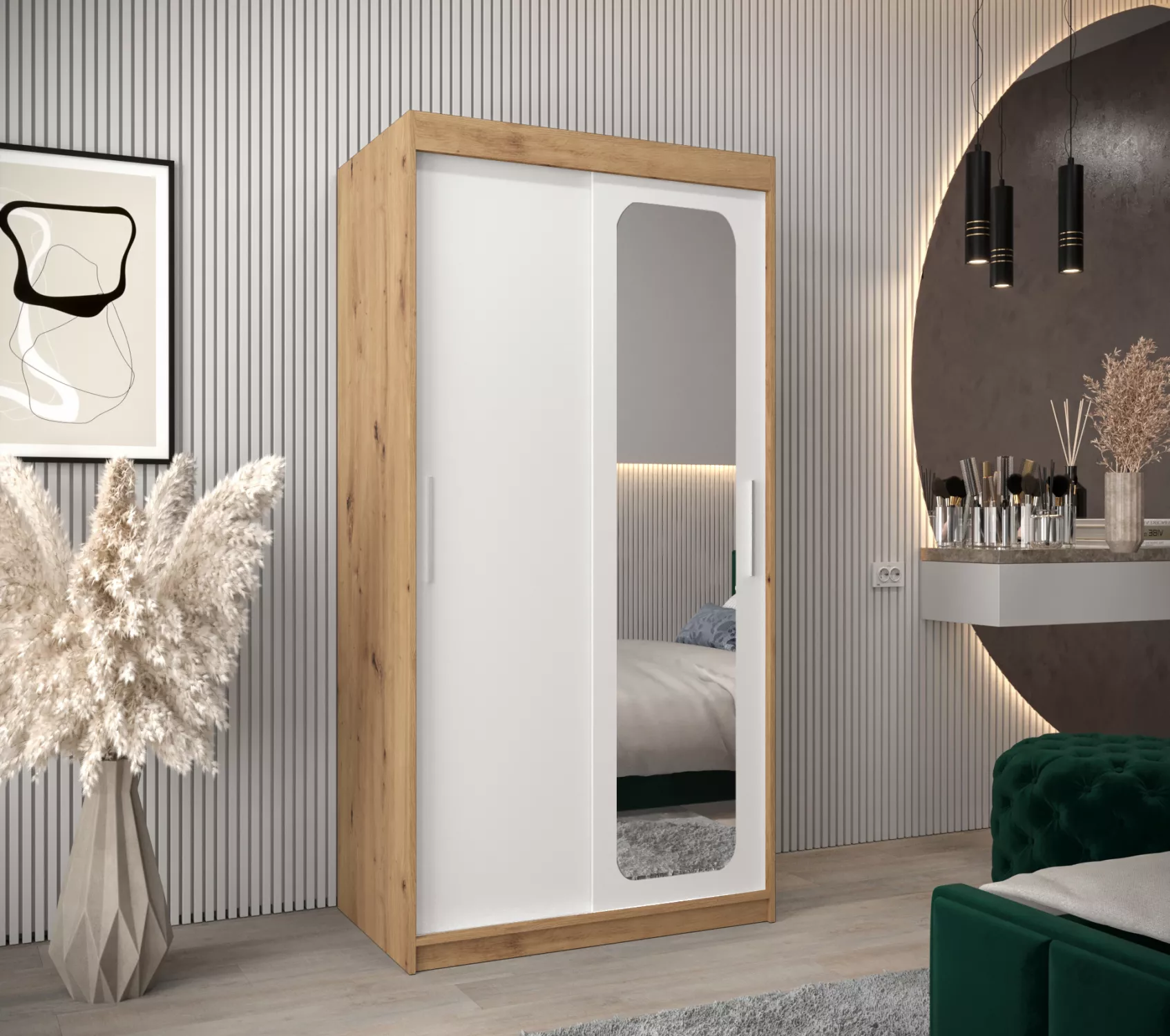 Zrcadlová skříň DONICELA zaujme především moderním designem a oválným zrcadlem. Vnitřek skříně je vybaven policovým systémem a 2 šatními tyčemi.