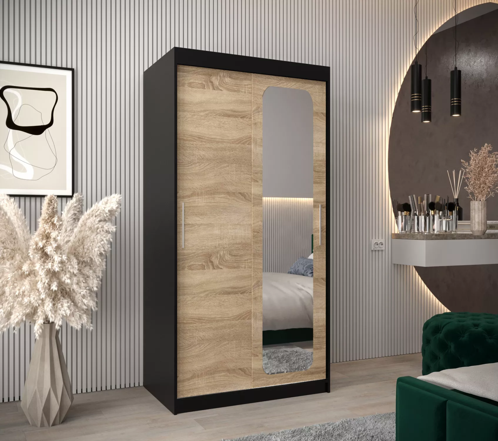Zrcadlová skříň DONICELA zaujme především moderním designem a oválným zrcadlem. Vnitřek skříně je vybaven policovým systémem a 2 šatními tyčemi.