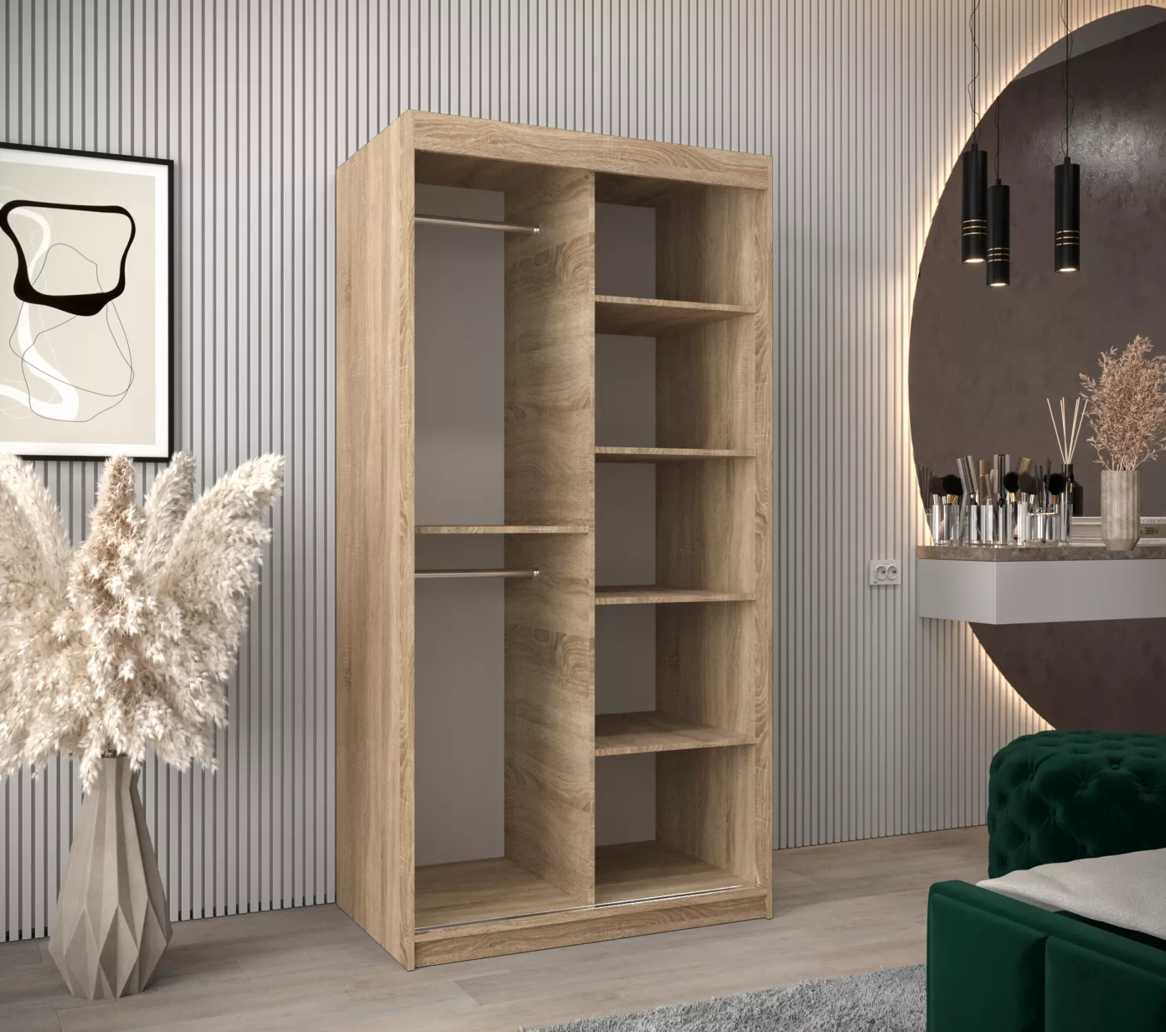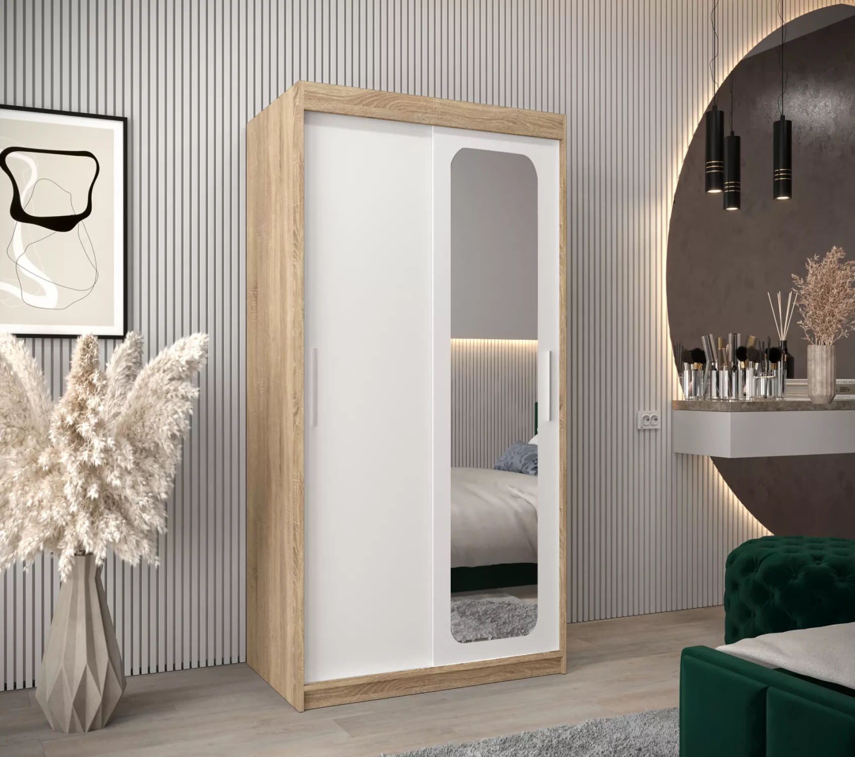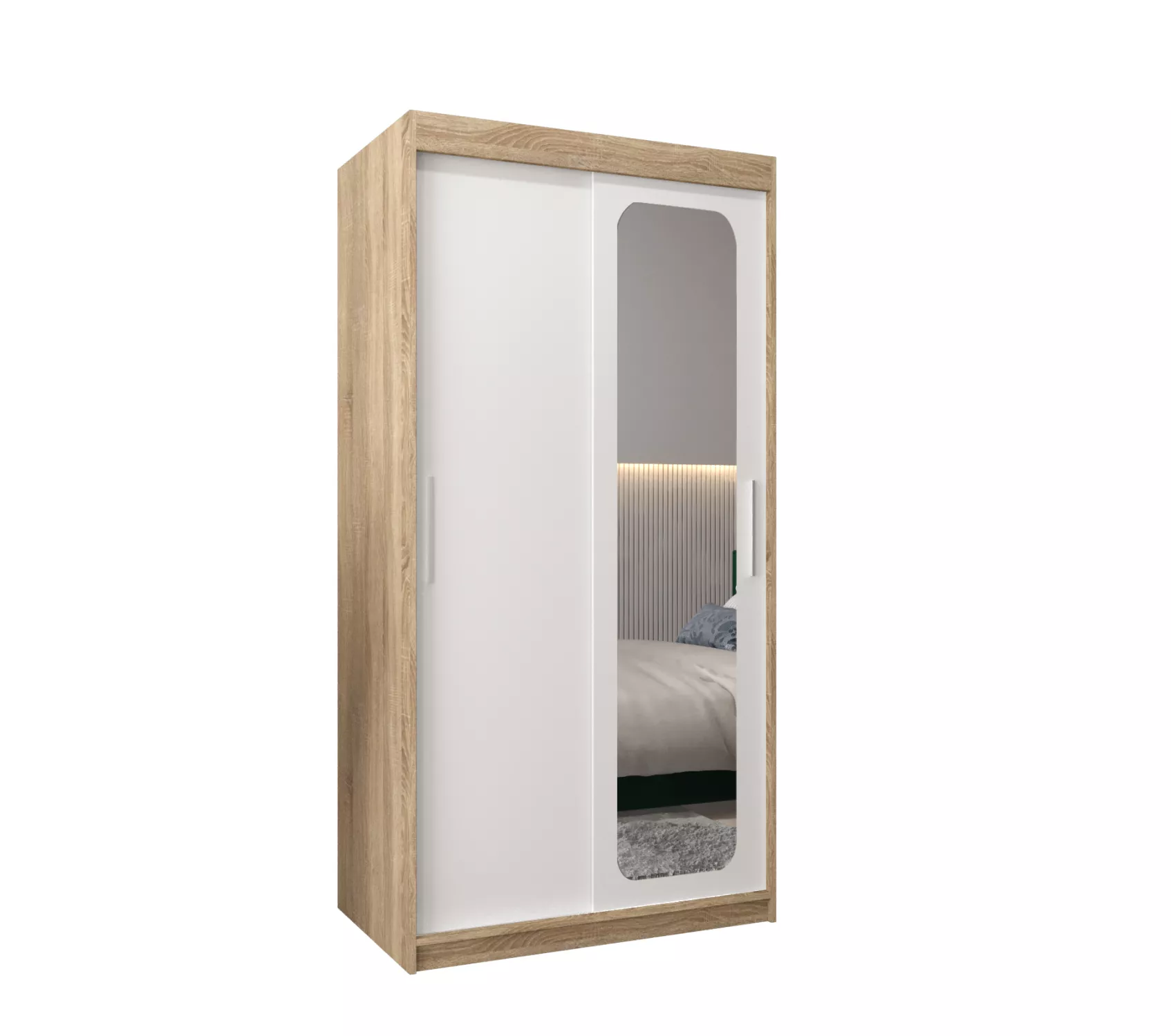 Zrcadlová skříň DONICELA zaujme především moderním designem a oválným zrcadlem. Vnitřek skříně je vybaven policovým systémem a 2 šatními tyčemi.