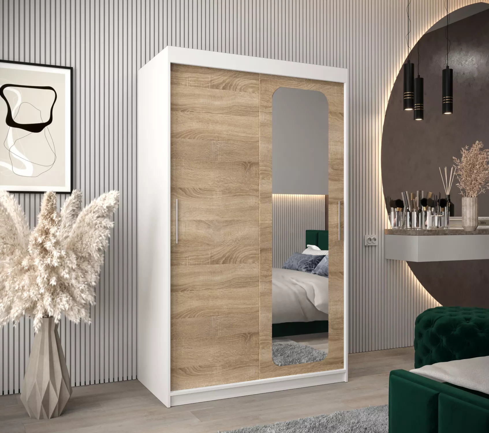 Zrcadlová skříň DONICELA zaujme především moderním designem a oválným zrcadlem. Vnitřek skříně je vybaven policovým systémem a 2 šatními tyčemi.
