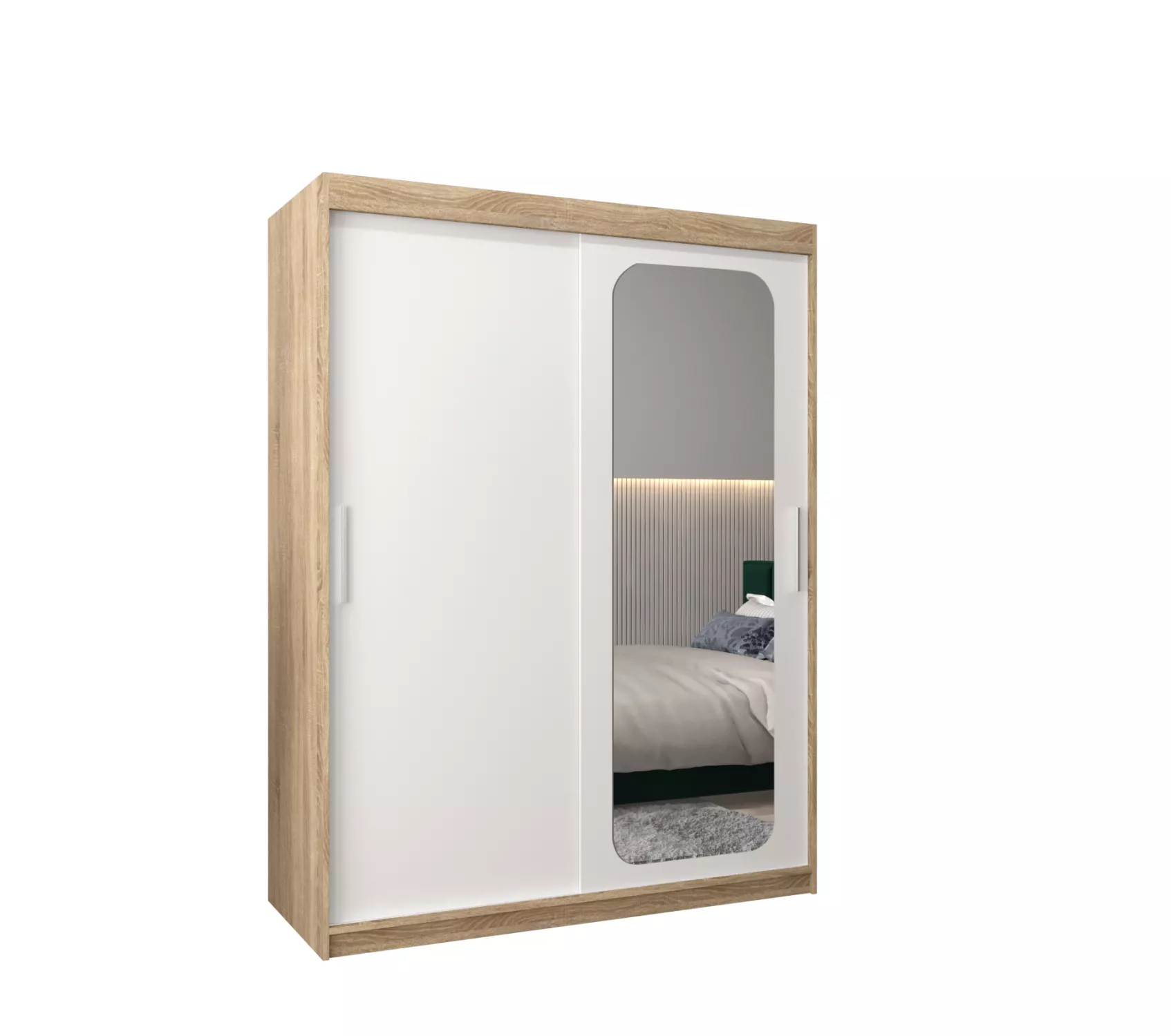 Zrcadlová skříň DONICELA zaujme především moderním designem a oválným zrcadlem. Vnitřek skříně je vybaven policovým systémem a 2 šatními tyčemi.