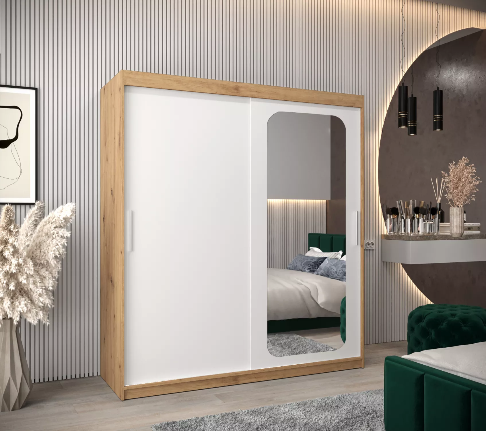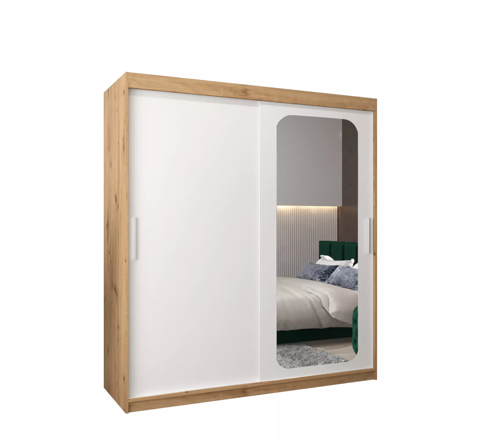 Zrcadlová skříň DONICELA zaujme především moderním designem a oválným zrcadlem. Vnitřek skříně je vybaven policovým systémem a 2 šatními tyčemi.