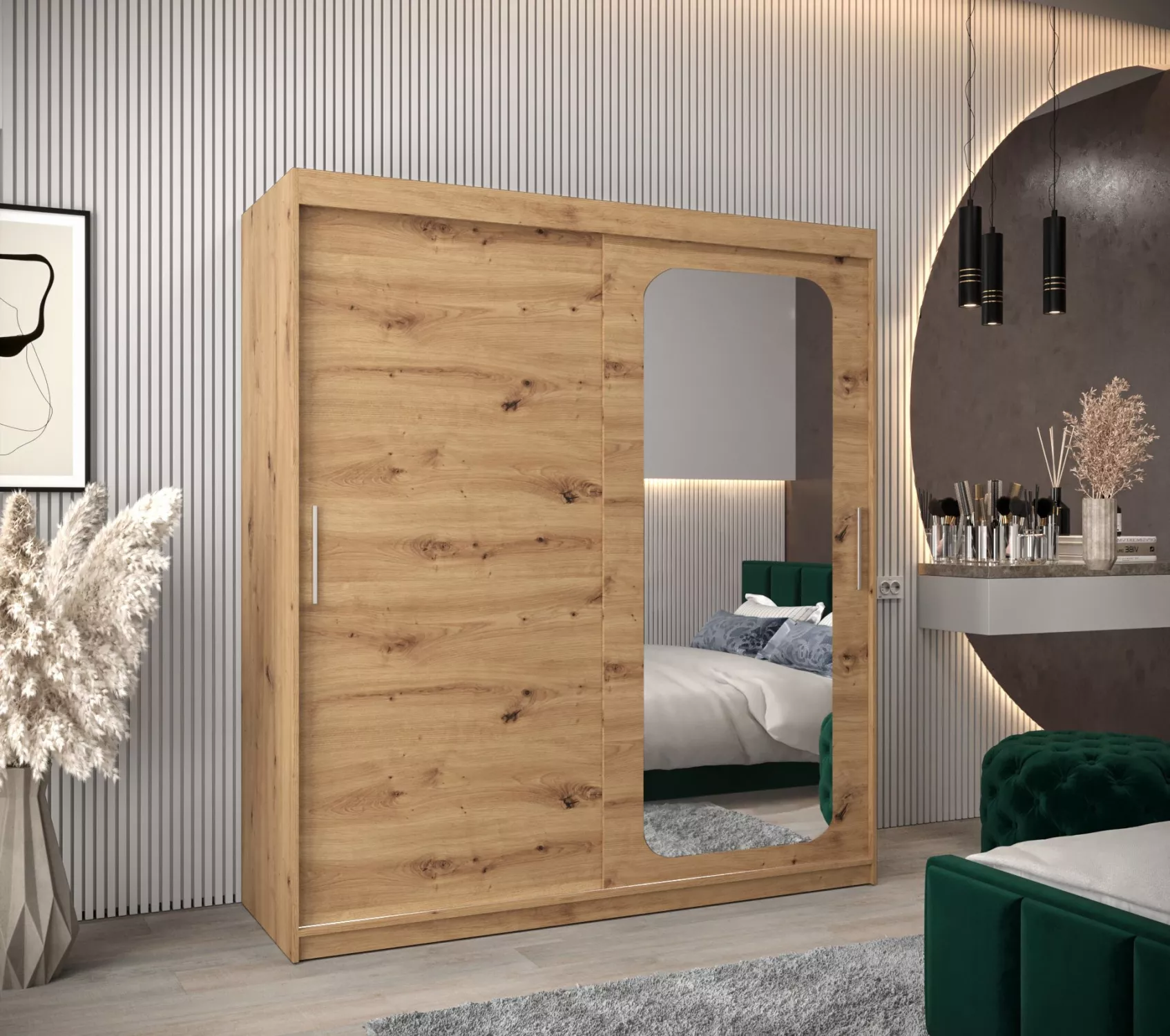 Zrcadlová skříň DONICELA zaujme především moderním designem a oválným zrcadlem. Vnitřek skříně je vybaven policovým systémem a 2 šatními tyčemi.