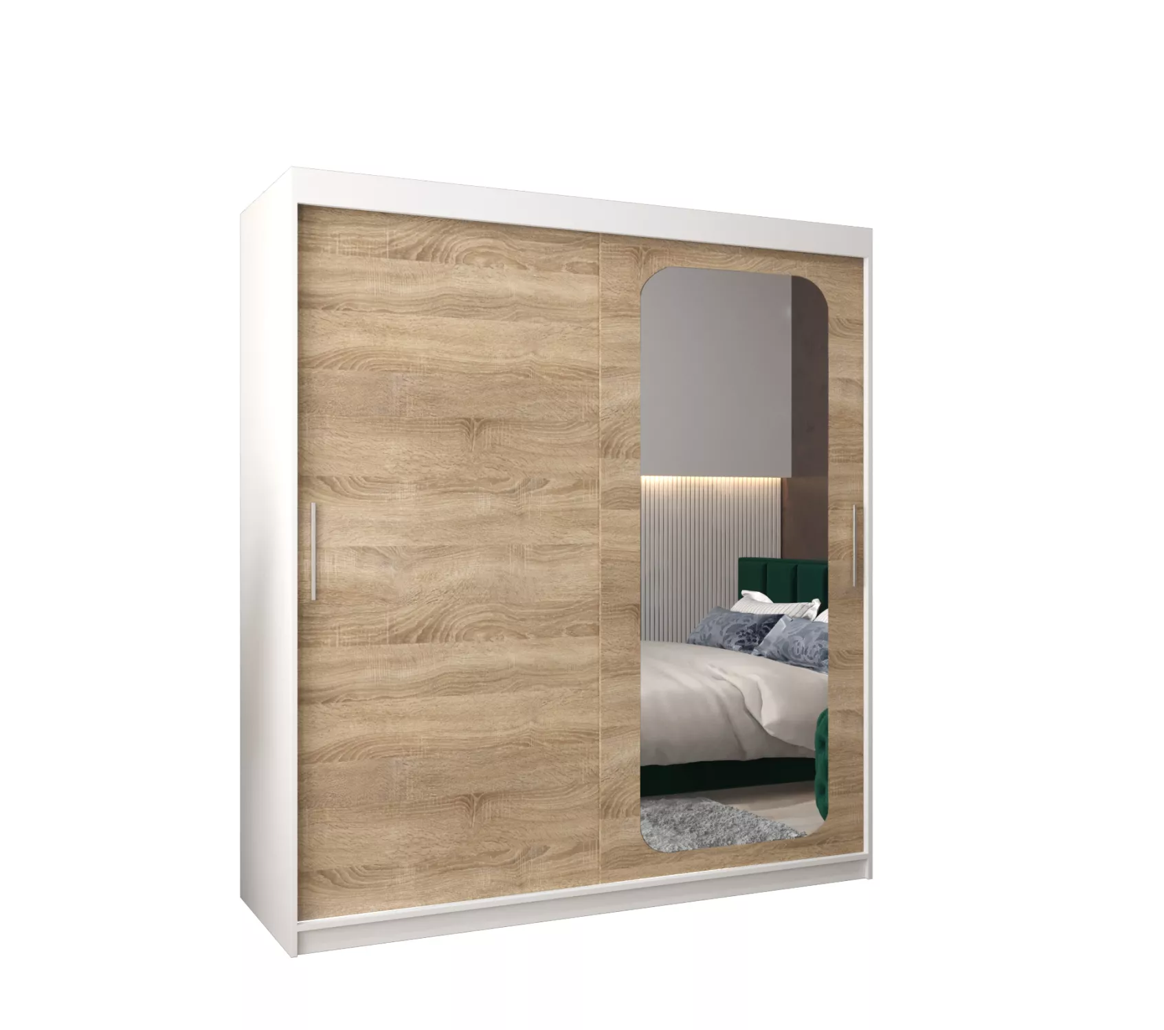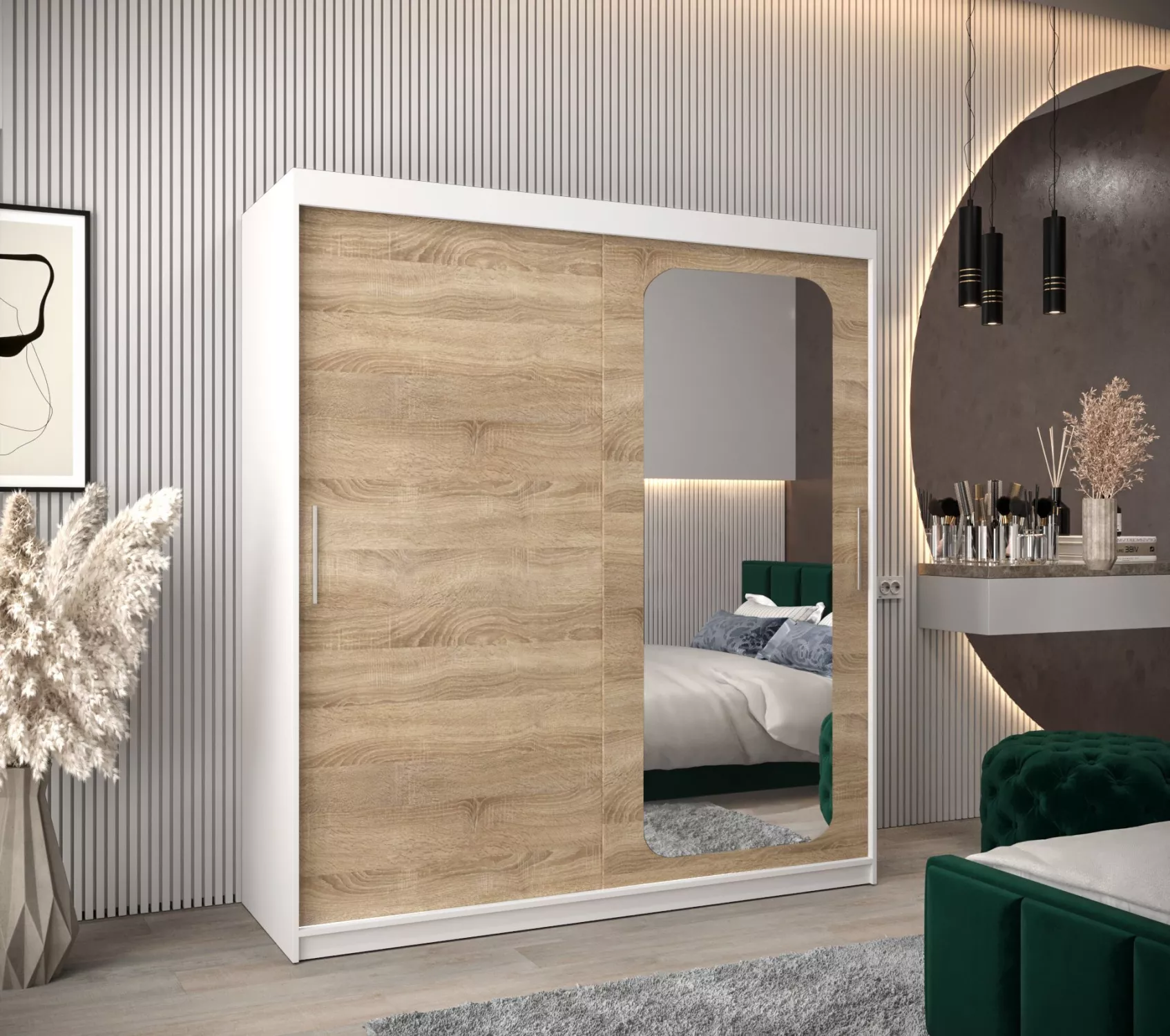 Zrcadlová skříň DONICELA zaujme především moderním designem a oválným zrcadlem. Vnitřek skříně je vybaven policovým systémem a 2 šatními tyčemi.