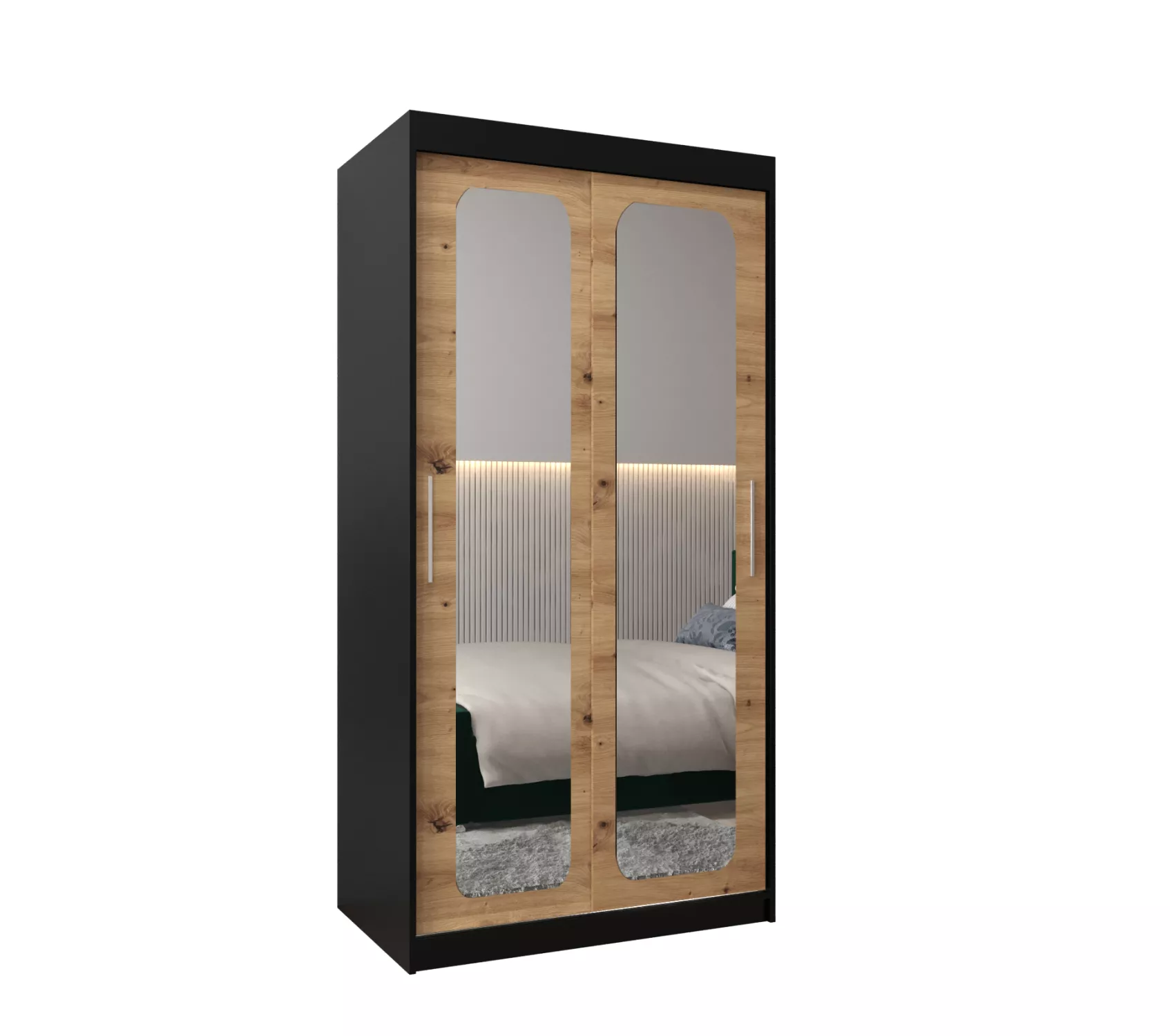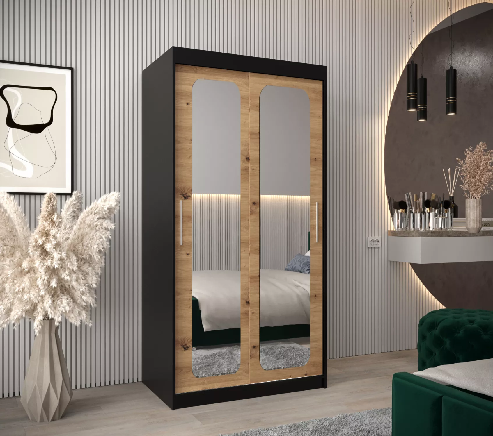 Zrcadlová skříň DONICELA zaujme především moderním designem a oválnými zrcadly. Vnitřek skříně je vybaven policovým systémem a 2 šatními tyčemi.