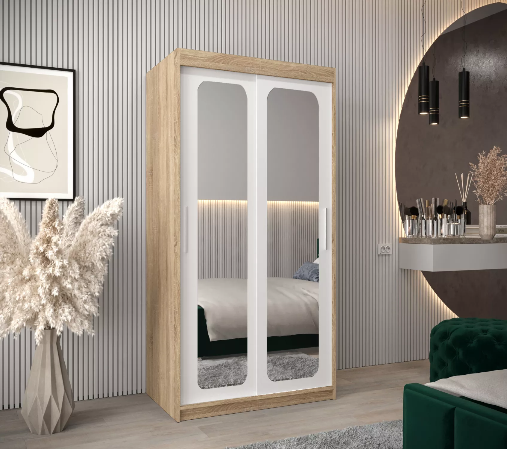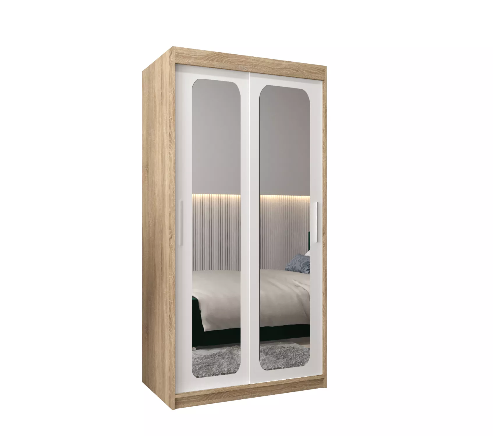 Zrcadlová skříň DONICELA zaujme především moderním designem a oválnými zrcadly. Vnitřek skříně je vybaven policovým systémem a 2 šatními tyčemi.