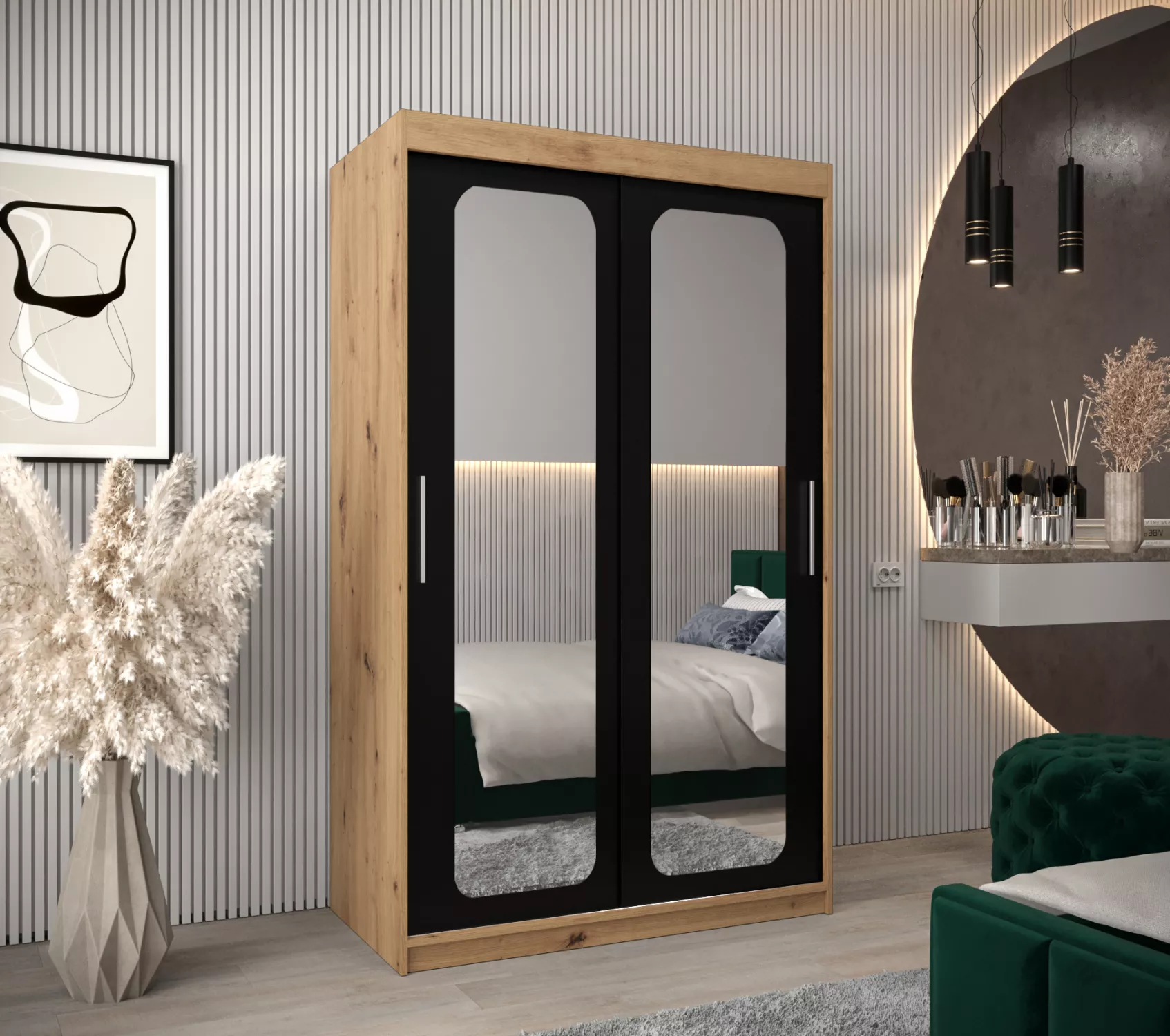 Zrcadlová skříň DONICELA zaujme především moderním designem a oválnými zrcadly. Vnitřek skříně je vybaven policovým systémem a 2 šatními tyčemi.