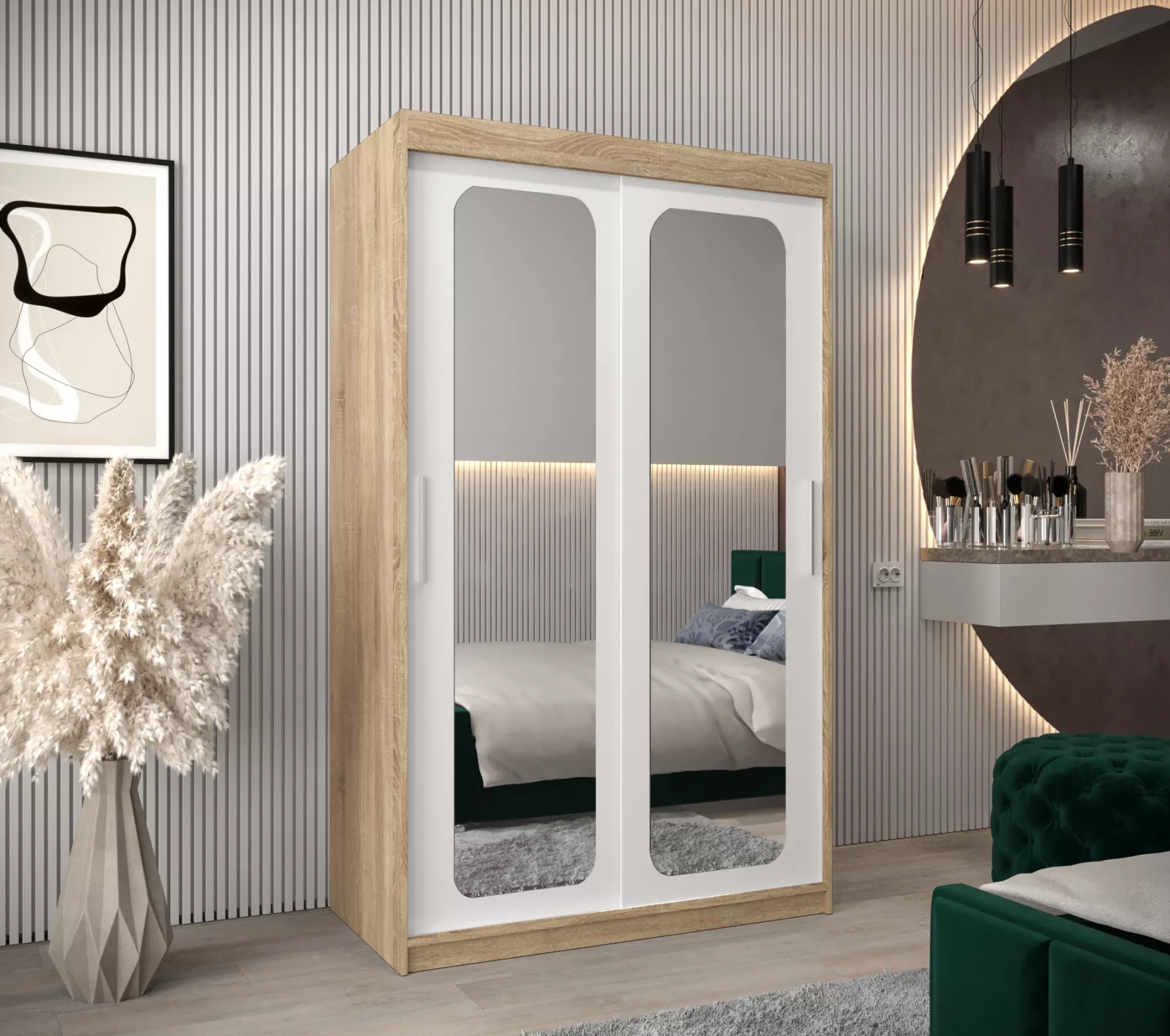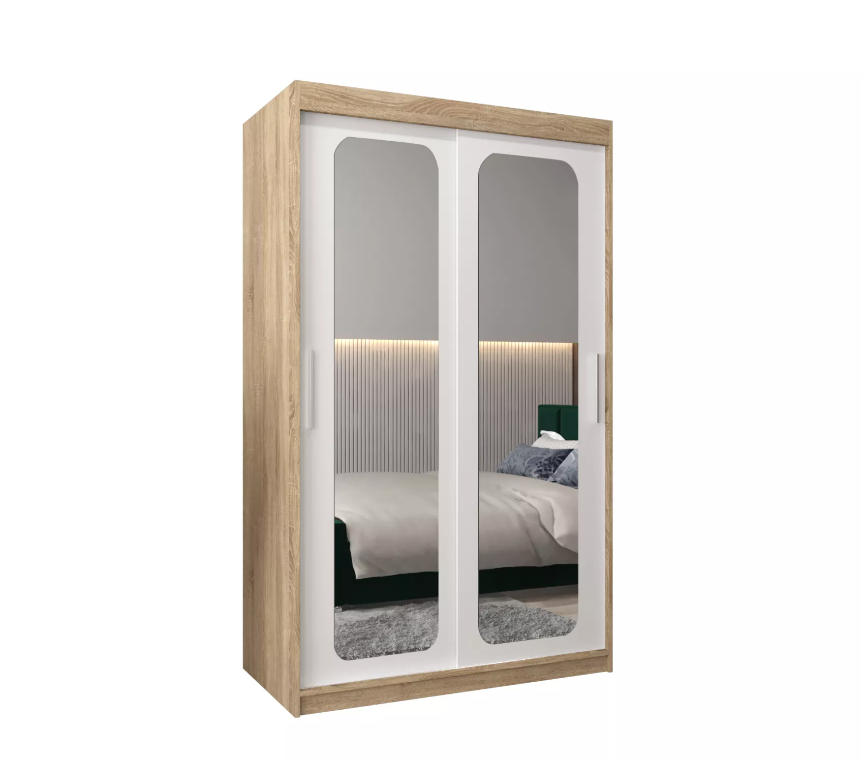 Zrcadlová skříň DONICELA zaujme především moderním designem a oválnými zrcadly. Vnitřek skříně je vybaven policovým systémem a 2 šatními tyčemi.